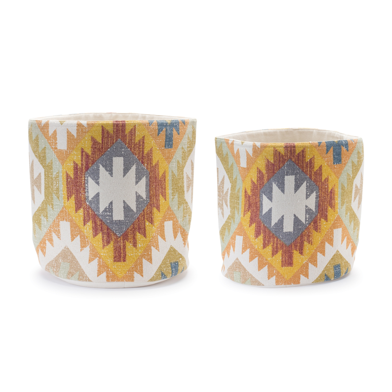 Bring the warmth of the Southwest into your home with this stunning set of Southwestern Woven Cotton Baskets. Crafted from durable cotton, these baskets feature vibrant orange and brown tones, enhanced by a bold geometric pattern. The set includes two sizes, offering versatility for any space. Whether you're organizing or decorating, these baskets add a touch of rustic charm, perfect for storing magazines, toys, blankets, and more. Add character to your living room, bedroom, or entryway with this stylish and functional set. Recommended for indoor use only. Sold in a set of two assorted sizes to create a balanced display in your home.