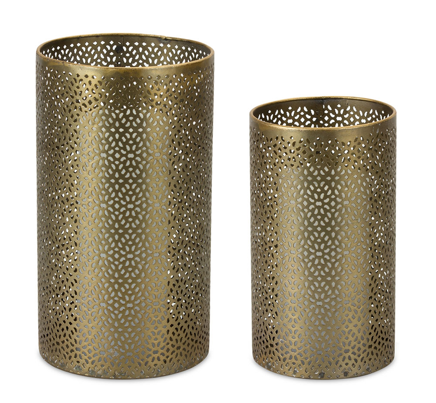 Add a touch of bohemian elegance to your space with this stunning set of Gold Punched Metal Candle Holders. Perfect for any season, these decorative pieces feature intricate ornamental patterns that cast captivating shadows when illuminated. The warm gold finish adds sophistication to any setting, while the versatile design complements a variety of decor styles. Crafted from durable metal, these candle holders are perfect for indoor or covered outdoor use. Display them together for a statement centerpiece or scatter them around your home to enhance cozy ambiance. Candles sold separately. Sold in a set of four pieces with two assorted sizes to create a balanced display in your home.