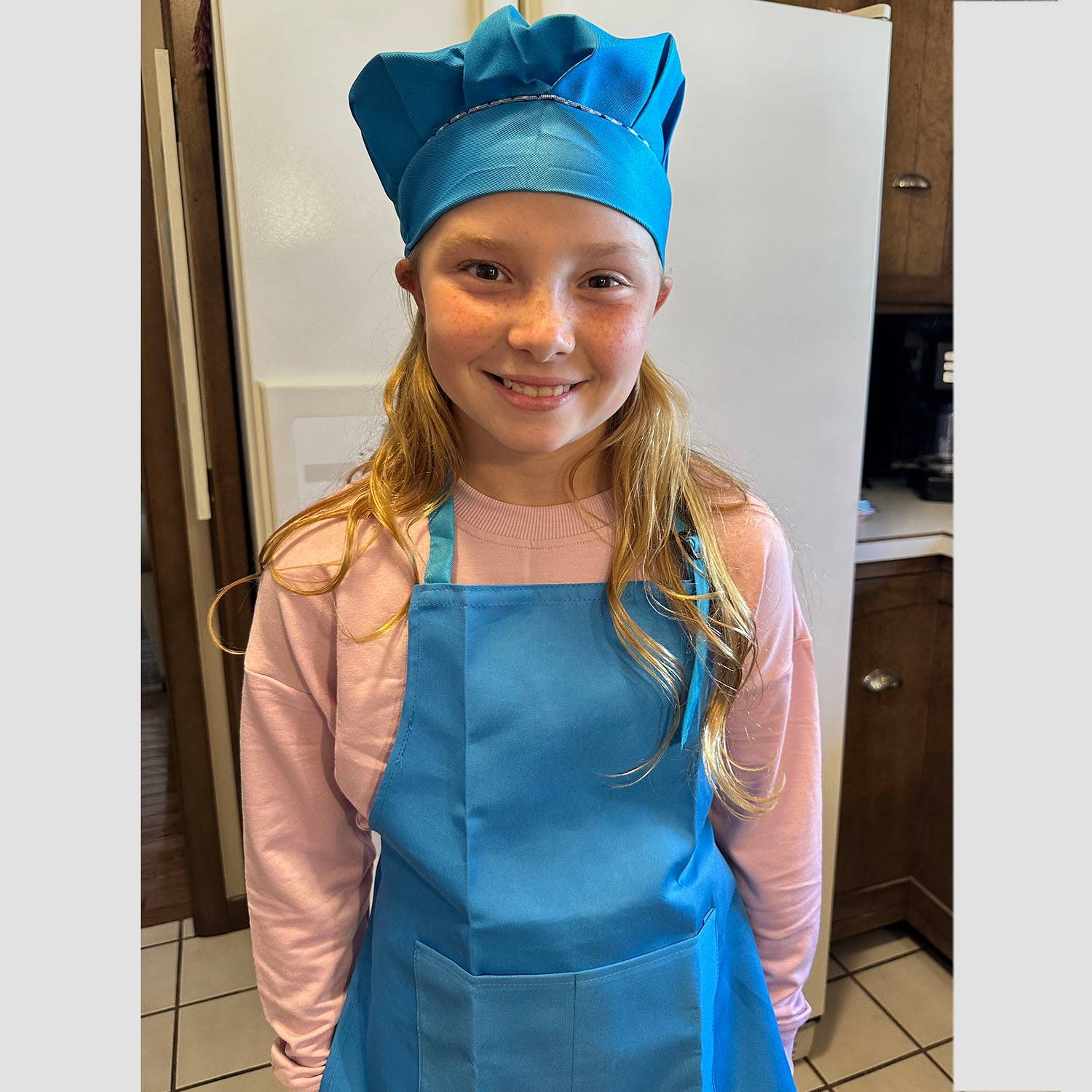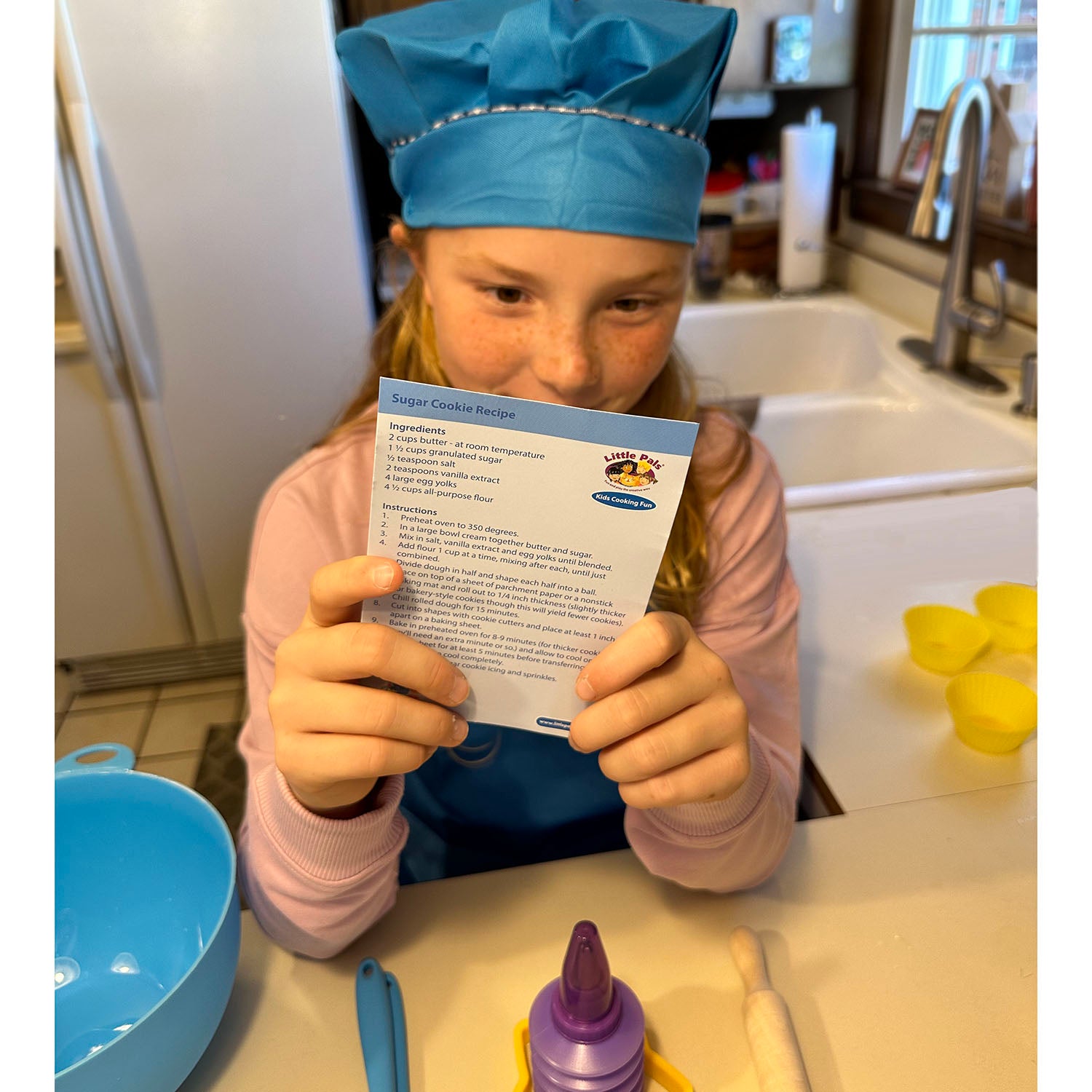 Begin your baking journey! Each set comes with a mixing bowl a plastic spoon a plastic spatula a cookie cutter an icing squirter with a stainless-steel nozzle a wooden rolling pin four silicone cupcake cases a cotton apron a chef's hat and recipe cards for cakes and cookies all neatly packed in a large transparent plastic bag. Choose from Pink or Blue every piece is designed to fit inside the transparent plastic bag. The bowl measures 7.5 inches in diameter. It is not recommended for children under three years old.