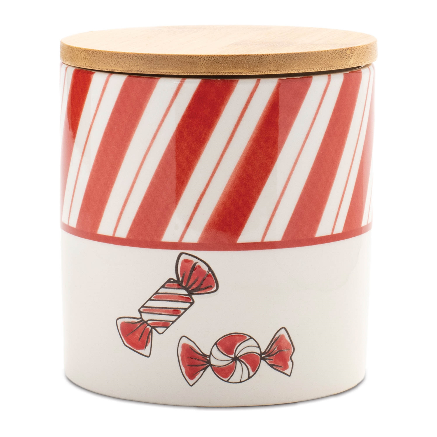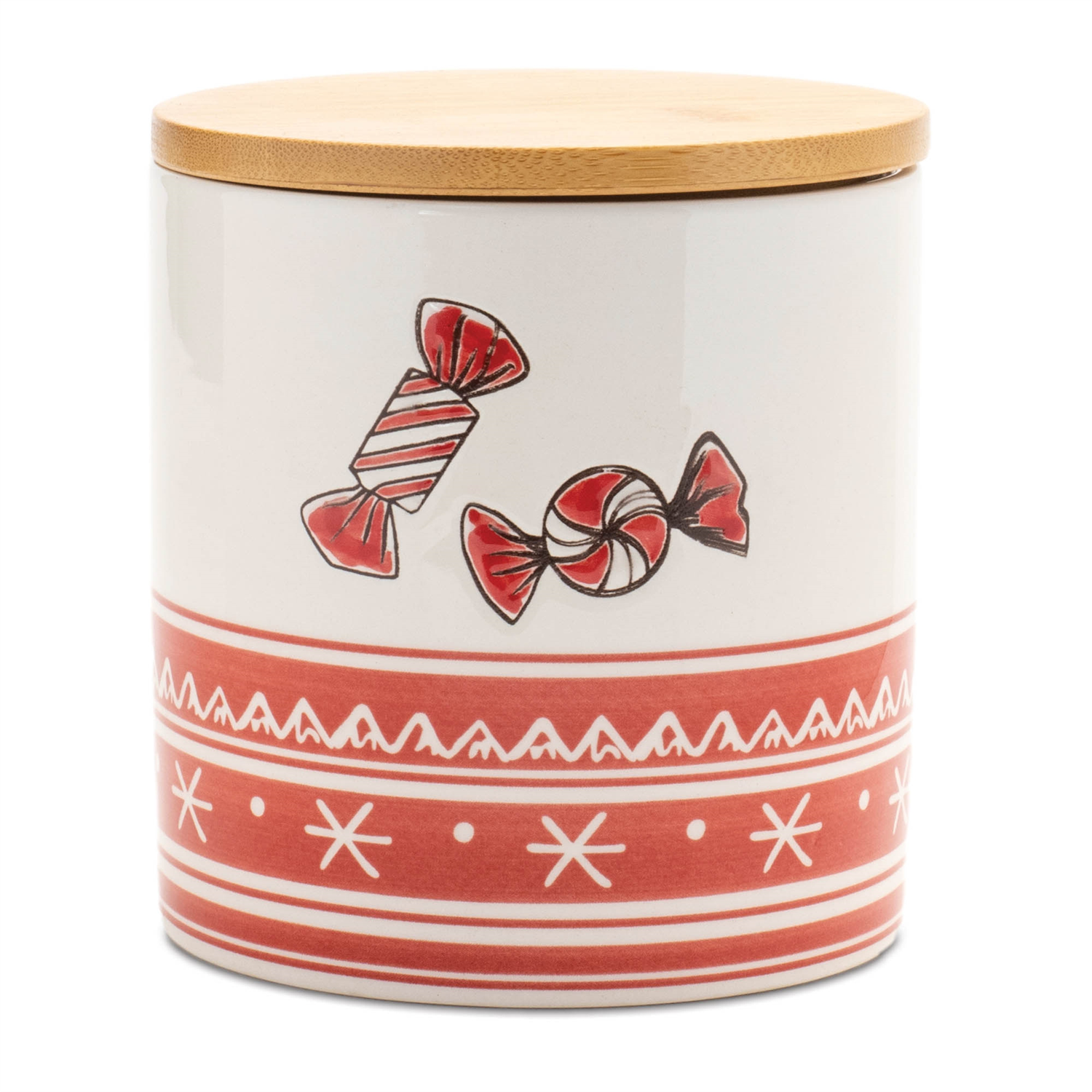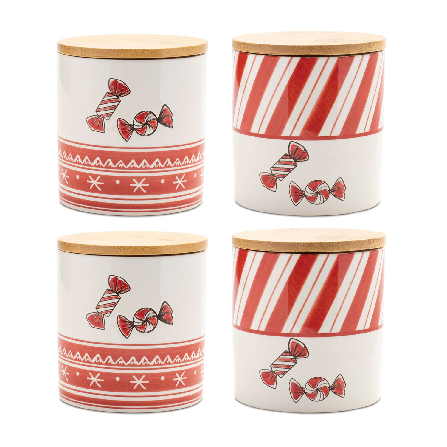 Add a sweet touch to your holiday decor with this Ceramic Peppermint Candy Canister Set. Featuring festive red and white tones with a shiny glazed finish, these canisters showcase striped and snowflake designs with peppermint candy accents. The natural wood lids provide functional storage, making them perfect for storing holiday sweets or small treats. Sold in a set of four with two assorted designs, these charming canisters are sure to entertain guests and brighten up your Christmas tabletop.