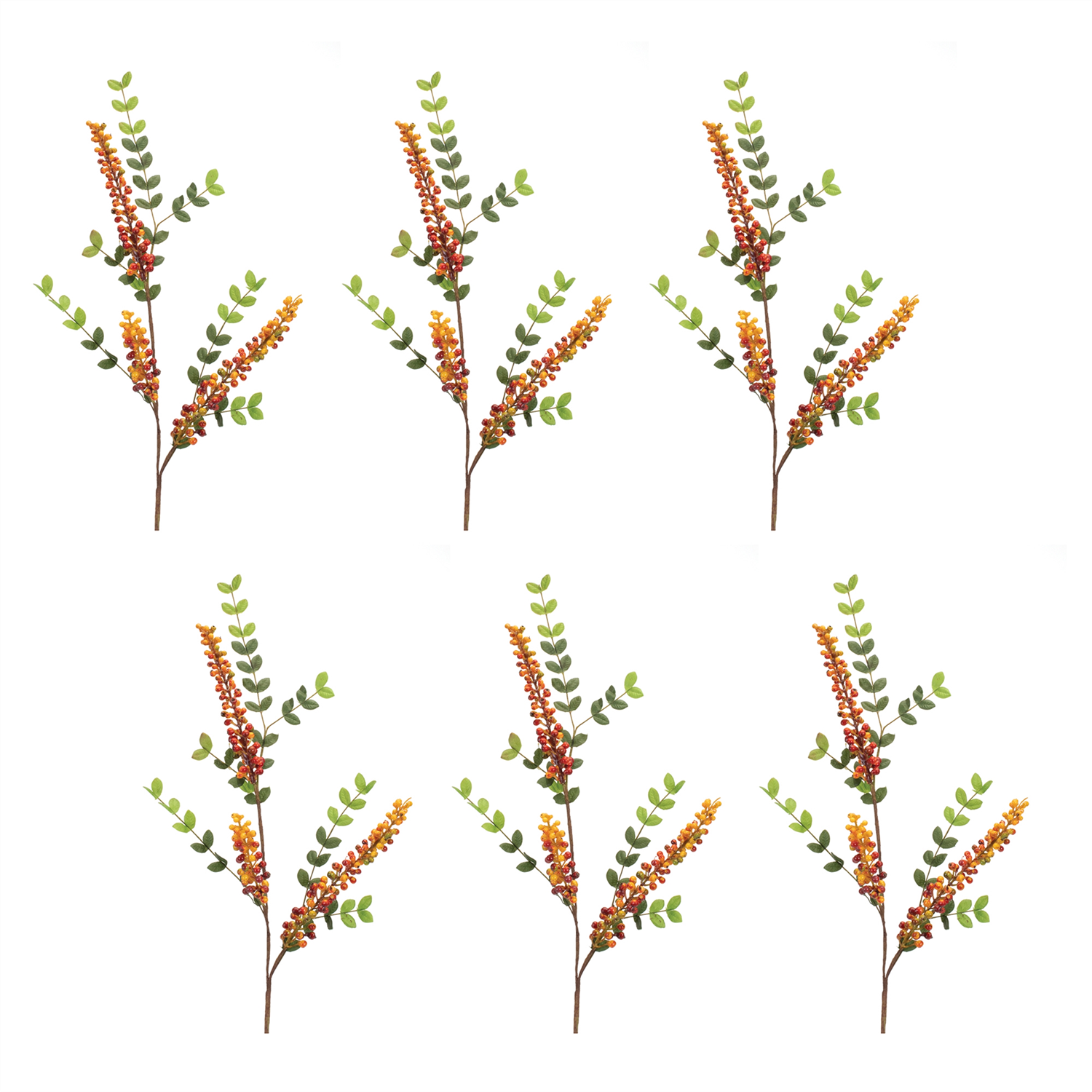 Bring the beauty of autumn indoors with this stunning set of Orange & Red Berry Foliage Sprays. Featuring lifelike stems, these sprays showcase vibrant orange and red berries accented by lush green foliage, creating a warm and inviting look. Designed for lasting beauty, each spray is crafted from high-quality polyester fabric, foam, and iron wire, ensuring durability and flexibility for easy arranging. Whether placed in a vase, woven into a seasonal wreath, or used to accentuate a centerpiece, these faux berry sprays add a natural touch of elegance to any space. Sold in a set of six matching pieces to make a statement in your floral vases or arrangements.