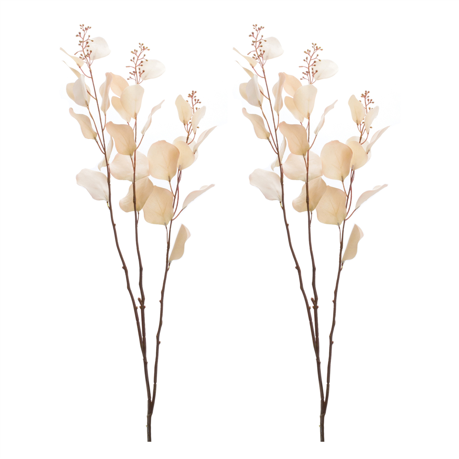 Elevate your space with the Seeded Eucalyptus Stem Set! Crafted with high-quality polyester, these 38" faux eucalyptus stems bring a natural yet sophisticated touch to any room. Their trendy beige hues make them versatile enough to complement any decor style, from modern to rustic. Whether placed in a vase, wall basket, or floral arrangement, these stems will infuse your home with a refreshing look that lasts for years to come. Perfect for indoor use, these durable faux stems offer both beauty and longevity. Sold in a set of two matching pieces to create a balanced display in your floral vases and arrangements.