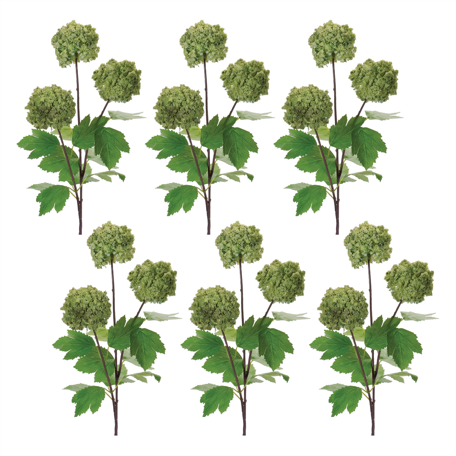 Add fresh, garden-inspired texture to your decor with this set of 6 Green Snowball Floral Sprays. Featuring deep green Viburnum "snowball" blooms and lush foliage, each spray offers a full, rounded floral shape that brings natural volume and richness to any arrangement. Made from durable polyester and iron with wired stems and branches, these versatile sprays are ideal for vases, garlands, wreaths, or hanging baskets – perfect for creating elegant displays with a botanical twist.