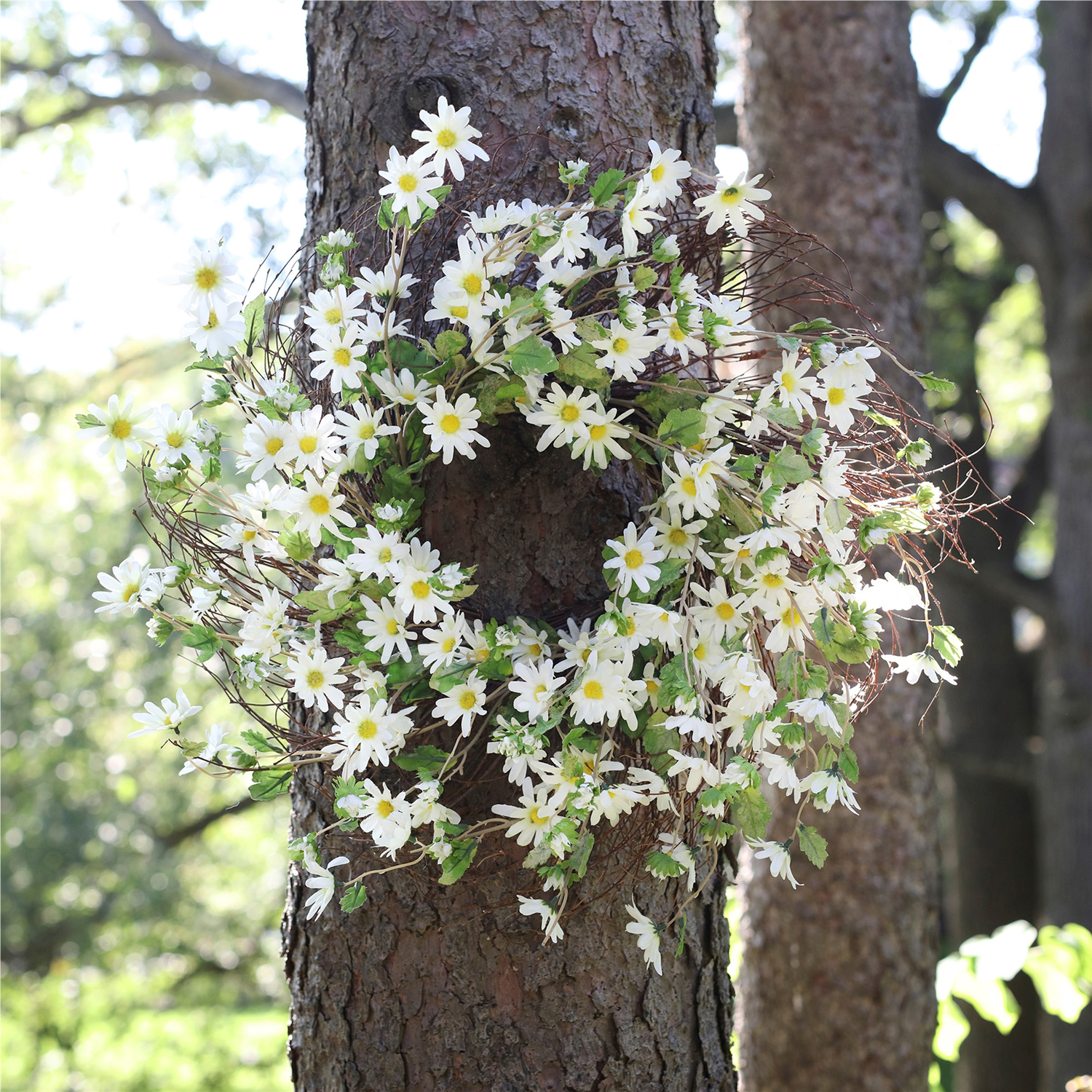 Celebrate the beauty of spring with our White Daisy Floral Wreath. Perfect for welcoming guests, this 23-inch wreath features a stunning arrangement of classic white daisies, vibrant green foliage, and a touch of natural twig base for added depth. Crafted from durable polyester, it's built to last for seasons of enjoyment. Whether hanging on your front door or adorning your entryway, this cheerful wreath brings a fresh, vibrant touch to any indoor or covered outdoor space. Measures 23 inches across when branches are extended and fluffed.