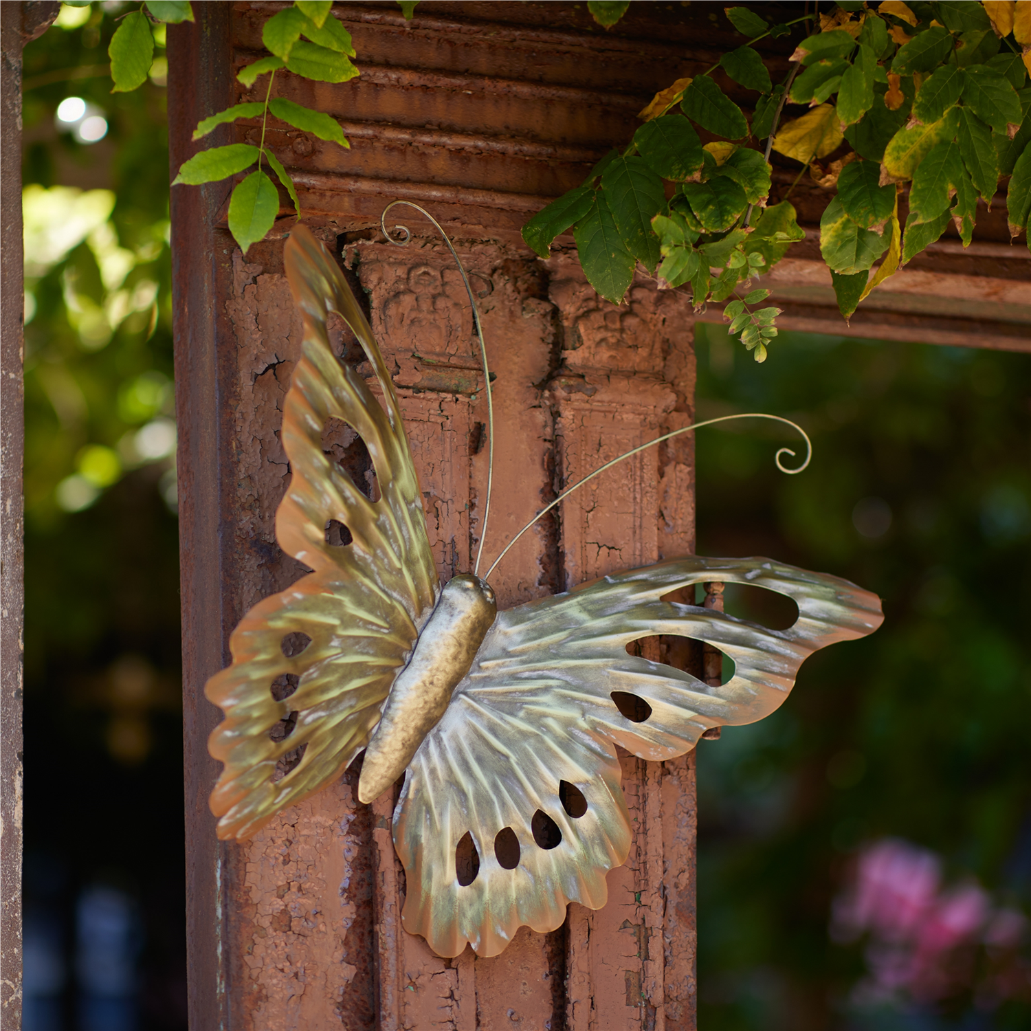 Add a touch of elegance and whimsy to your garden with this Set of 2 Distressed Metal Butterfly Wall Hangings. Featuring a delicate butterfly design with intricate cut-out wings and wire antennae, these wall hangings showcase chic gold and silver tones with a rustic, distressed finish. Perfect for hanging on a garden fence, these butterflies will flutter into your space with vintage-inspired charm and beauty.