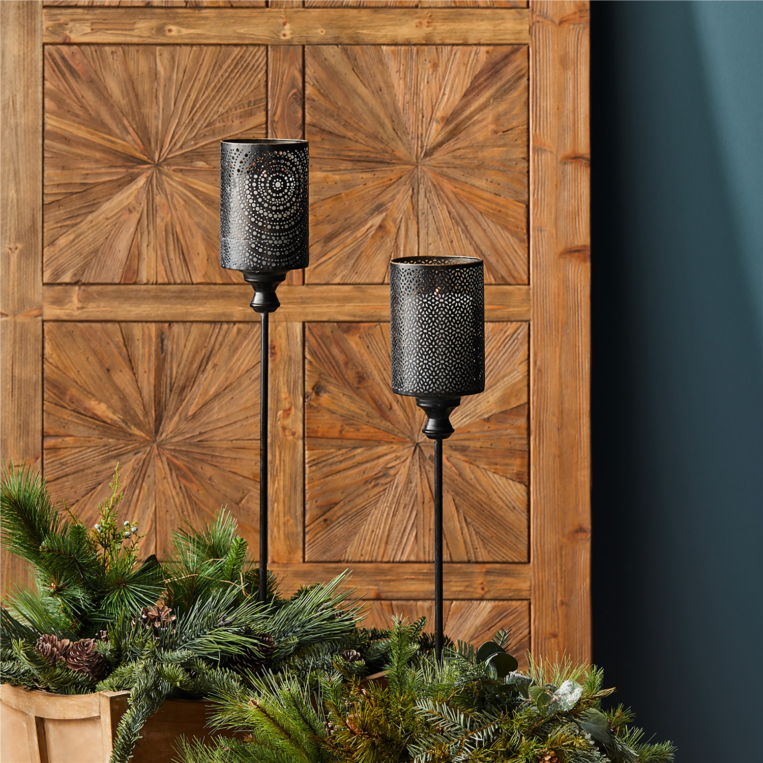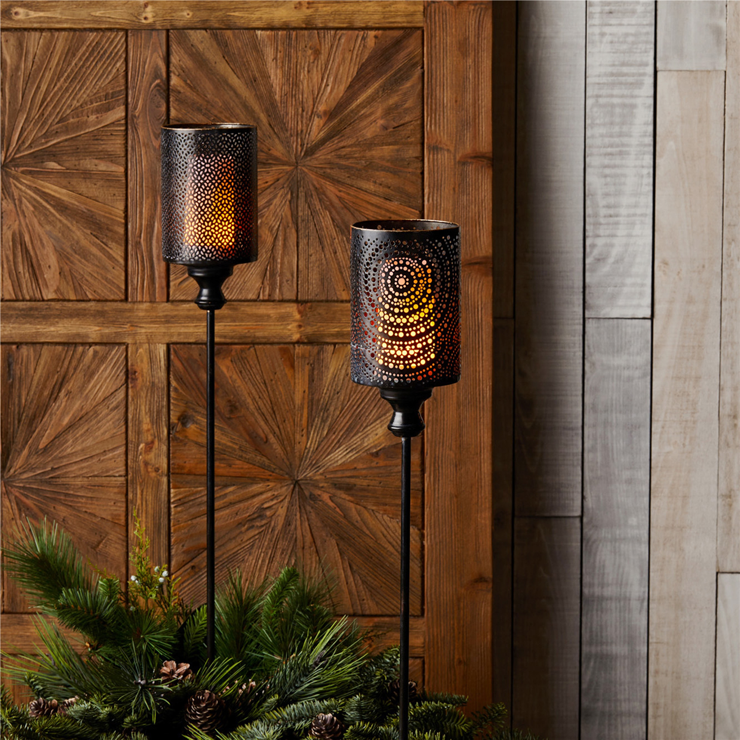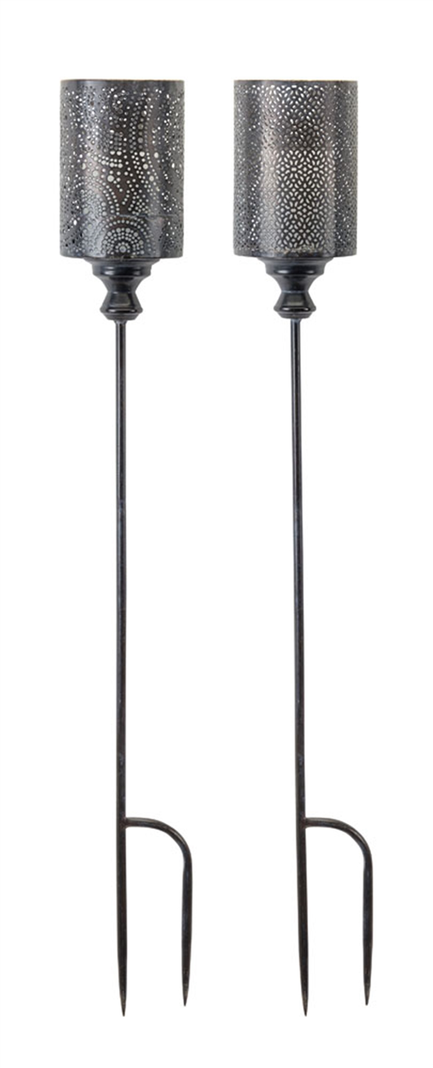 Illuminate your outdoor space with this elegant Set of 4 Black Punched Metal Candle Holder Garden Stakes. Designed with intricate geometric patterns and a sleek black and gold finish, these stakes bring a touch of sophistication to your garden, patio, or walkway. Crafted from durable metal, they are built to withstand the elements, making them ideal for both indoor and outdoor use. Simply add 4x4 pillar candles to create a warm and inviting ambiance in any setting.