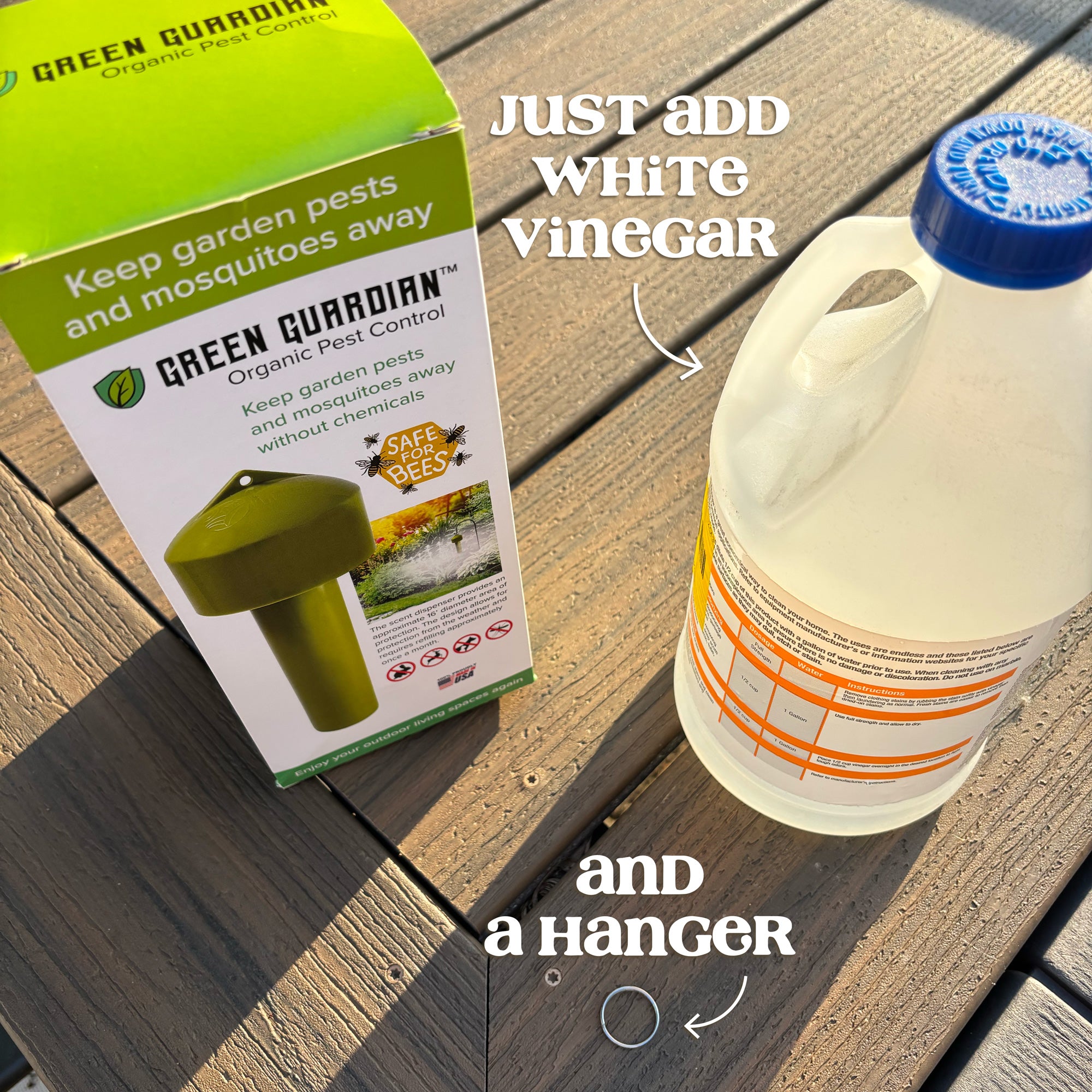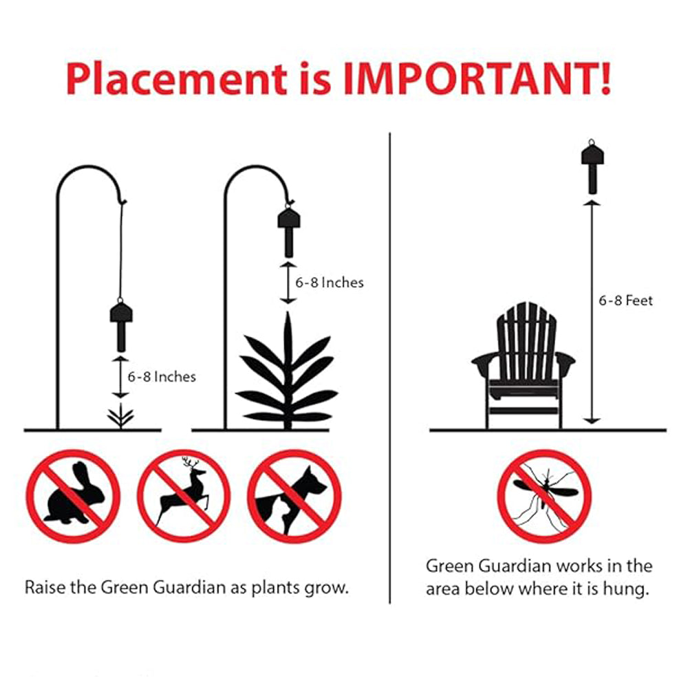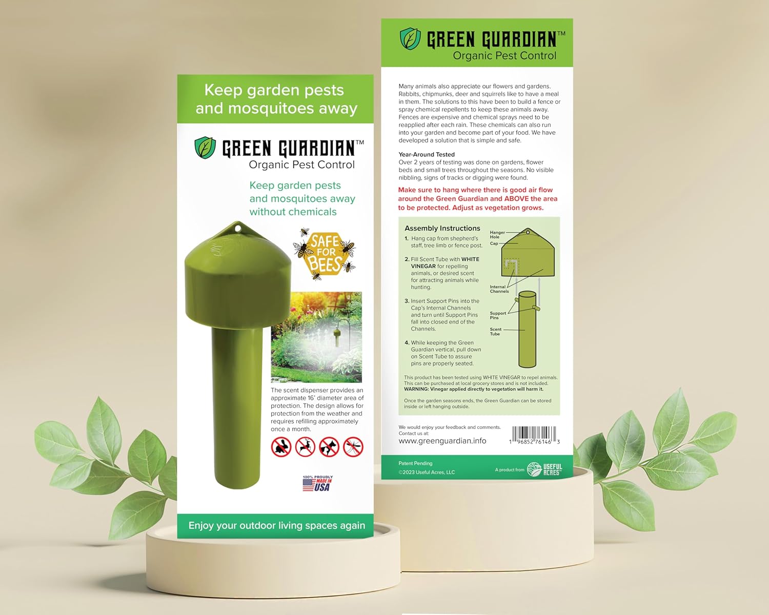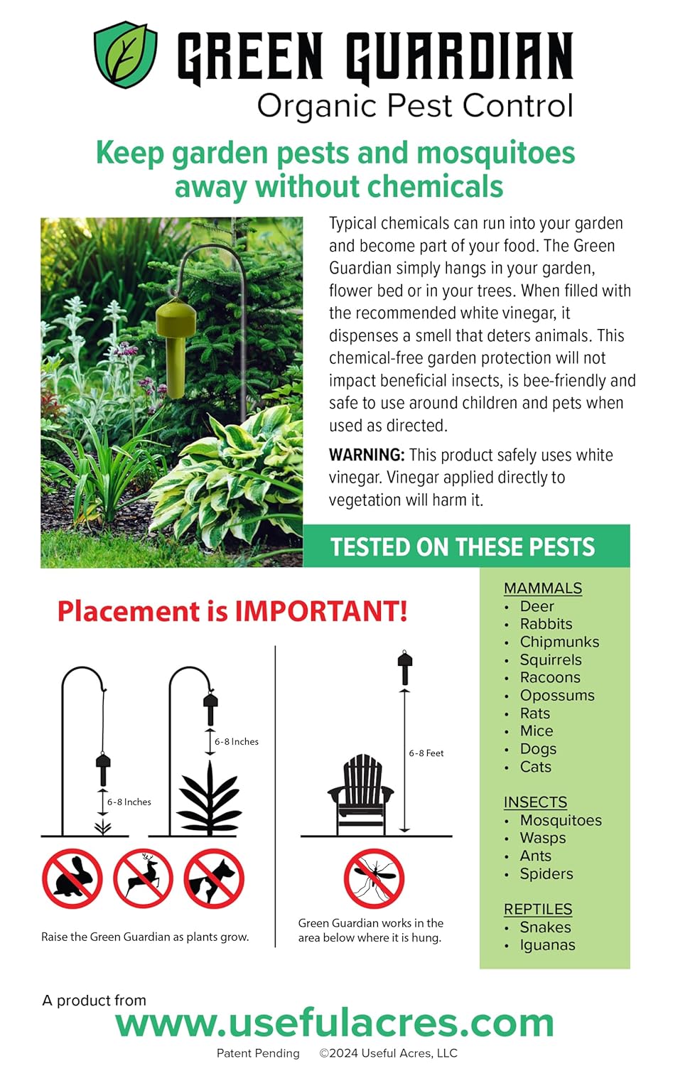 The Green Guardian is an eco-friendly garden and mosquito repellent designed to keep pests away using a simple and chemical-free method: white vinegar. It works through a dispensing mechanism that uses vinegar as a scent-based repellent protecting an area of approximately 16 feet in diameter. The scent is only detectable by humans when standing very close to the unit and the vinegar is never applied directly to plants or soil ensuring no damage occurs. Built with a durable weatherproof design it can be used year-round in outdoor spaces.This product is safe for families pets and pollinators. It contains no chemicals introduces no toxins into food or soil and does not affect bees or beneficial insects. When used as directed it is safe in areas frequented by children and pets.The Green Guardian is effective at repelling a wide variety of common nuisances including rabbits chipmunks deer squirrels dogs cats mosquitoes and even discouraging pets from pottying in unwanted areas.It can be placed in gardens flower beds patios trees porches decks and campsites and can also be repositioned over planted bulbs during the winter months for continued protection. The unit stands 11 inches tall is made from durable all-weather materials and requires a simple vinegar refill approximately once a month. Proudly made in the USA it offers a natural safe and effective way to protect outdoor spaces year-round.