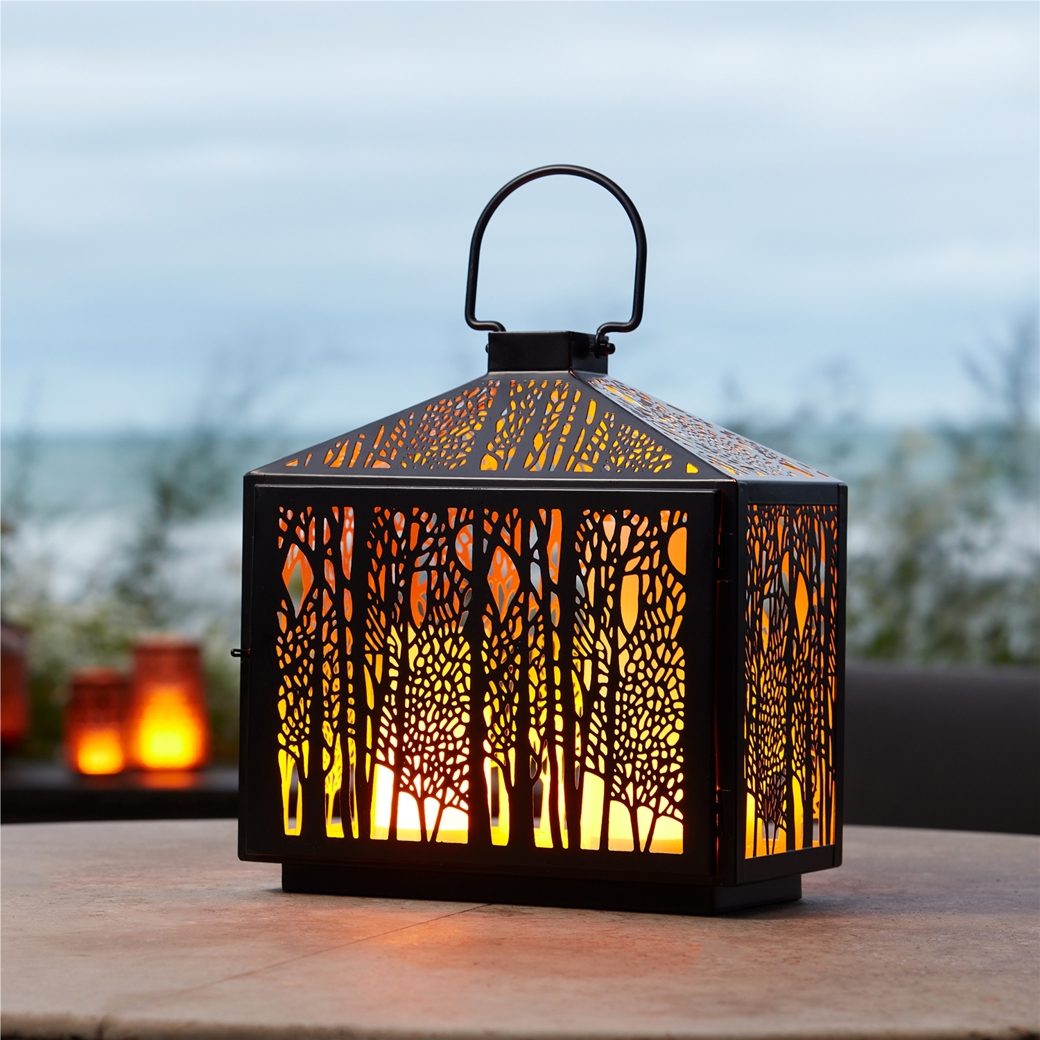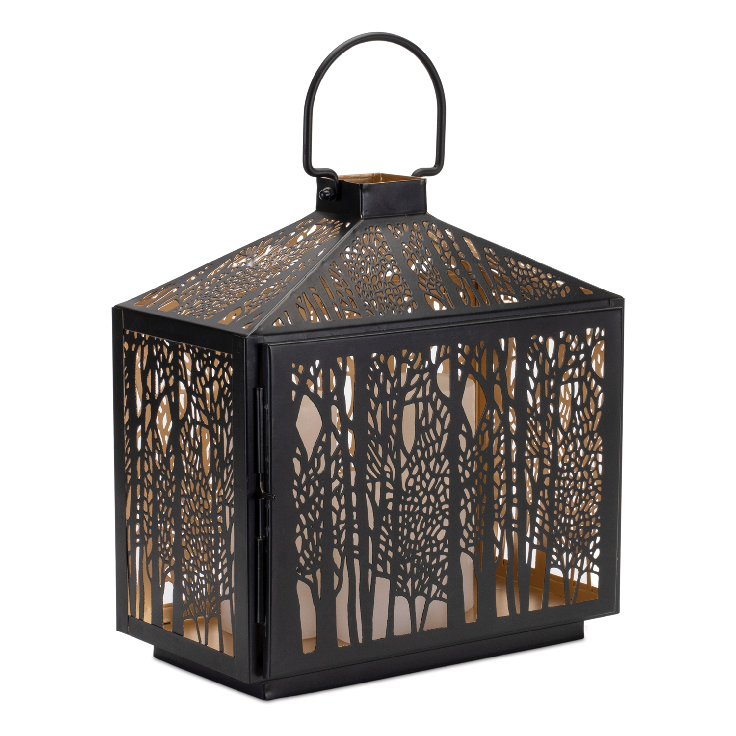 Elevate your home decor with the Forest Cut Metal Lantern, a stunning blend of rustic charm and contemporary elegance. Standing at 12" tall, this intricately designed lantern features a laser-cut forest pattern that adds an enchanting touch to any space. The black finish and gold accent inside provide a timeless appeal, perfect for both everyday and holiday use. Crafted from durable iron, this lantern is built to last, making it an ideal addition to your indoor decor. Simply add your favorite candles for a warm, glowing ambiance.