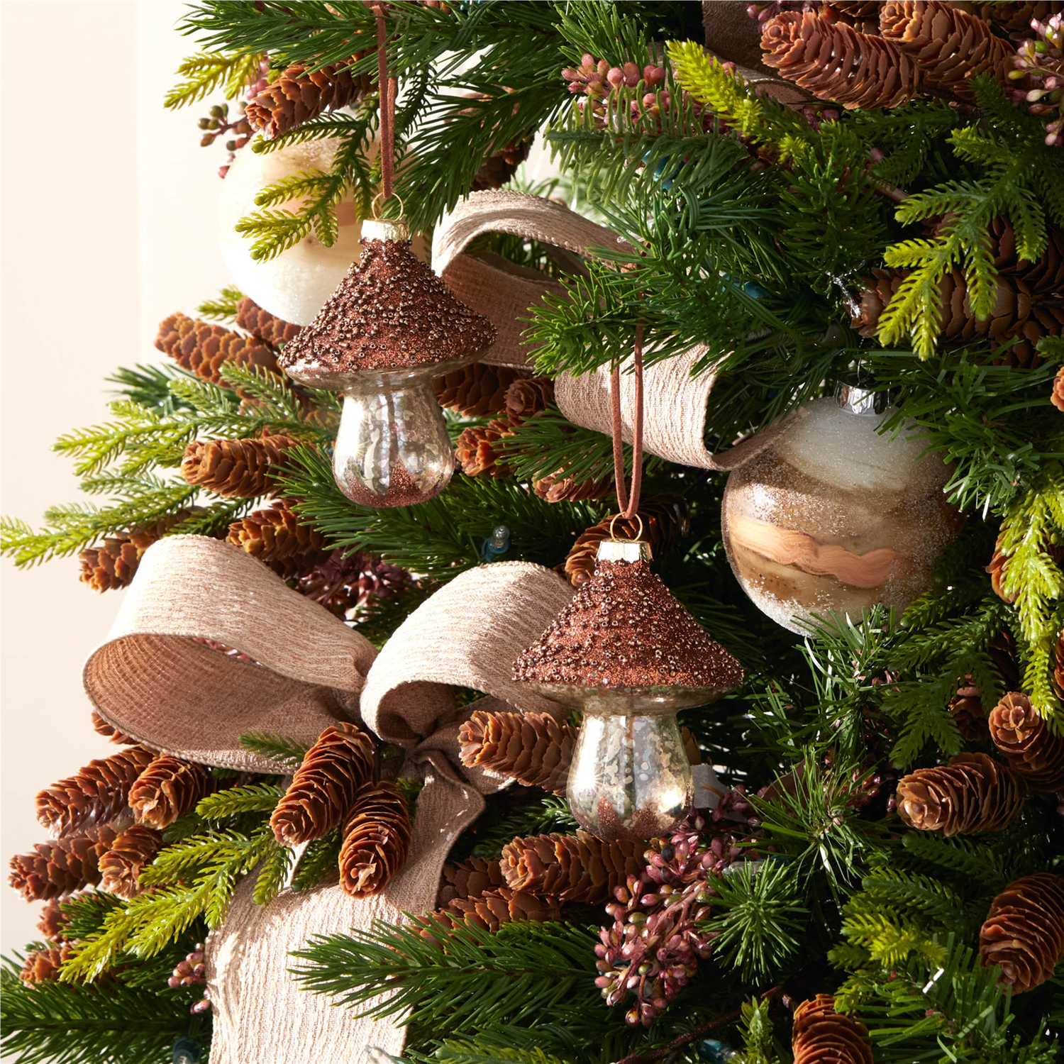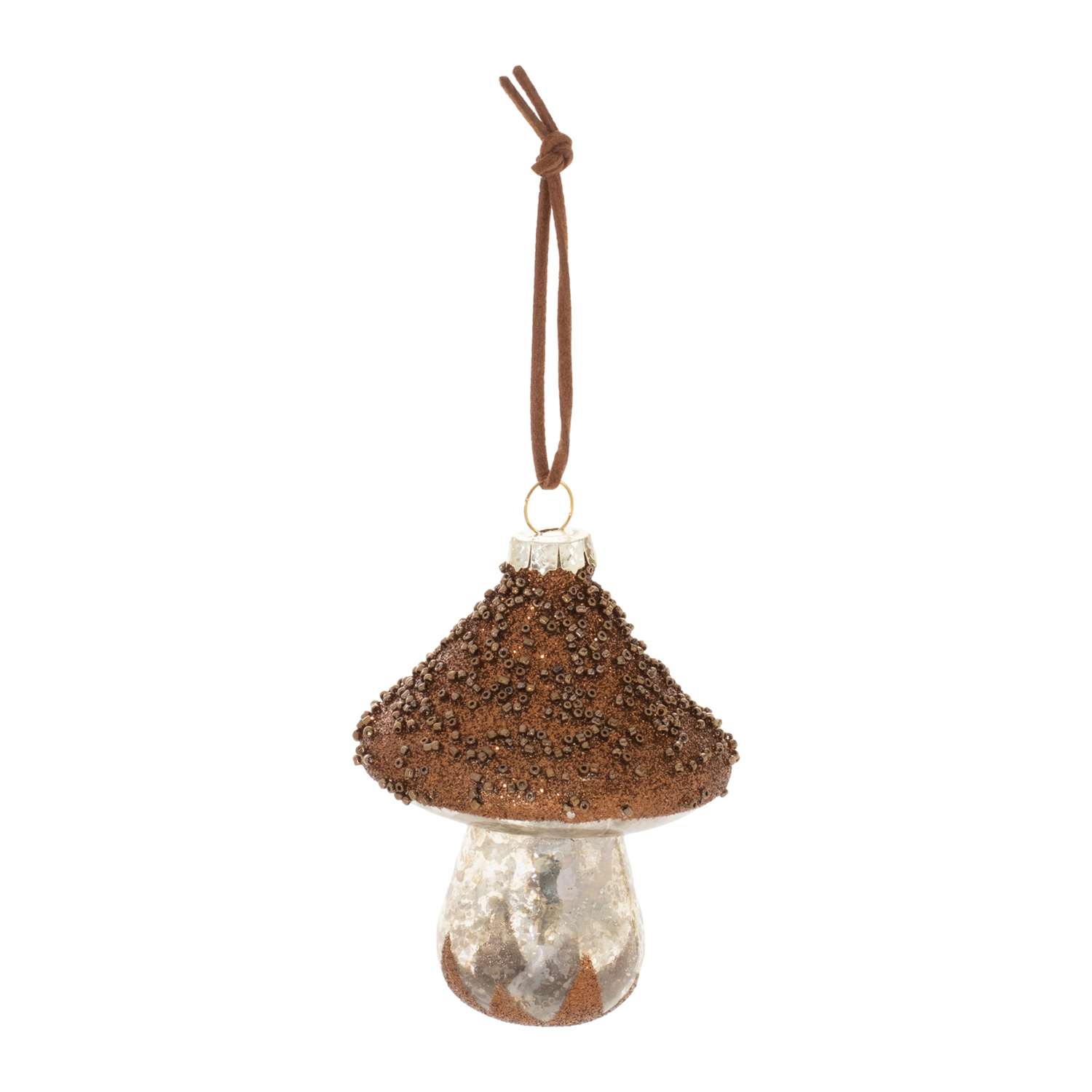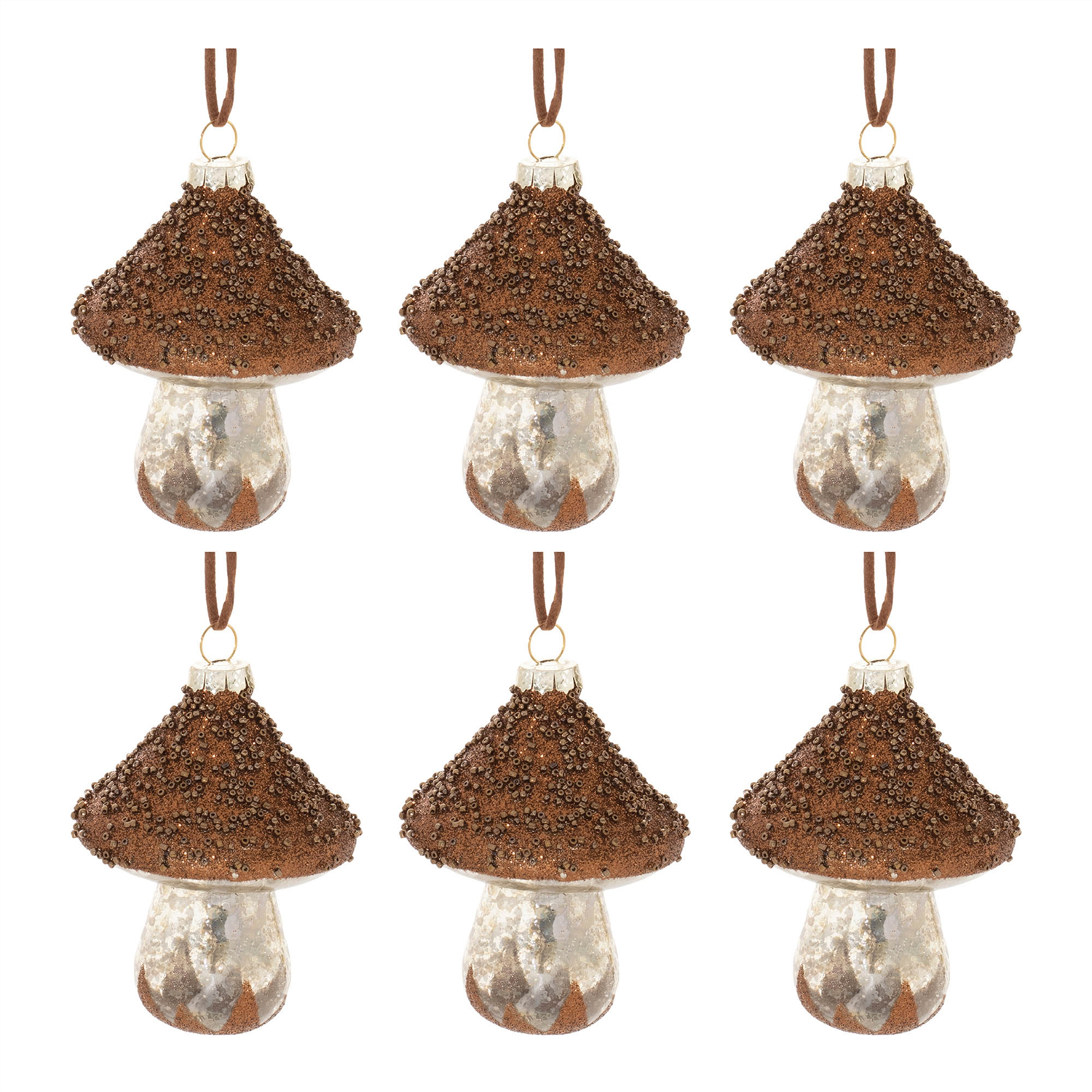 Bring a touch of whimsical woodland charm to your holiday decor with this set of Beaded Glass Mushroom Ornaments. Designed in wintry brown and grey tones with a mercury glass finish, these ornaments feature a playful mushroom shape and are adorned with elegant beaded accents for a sophisticated look. The delicate leather cord hanger and silver ornament cap complete the rustic, nature-inspired design. Perfect for adding woodland holiday cheer to your Christmas tree, wreath, or garland, this set of 6 ornaments make a charming statement in any nature-themed display.