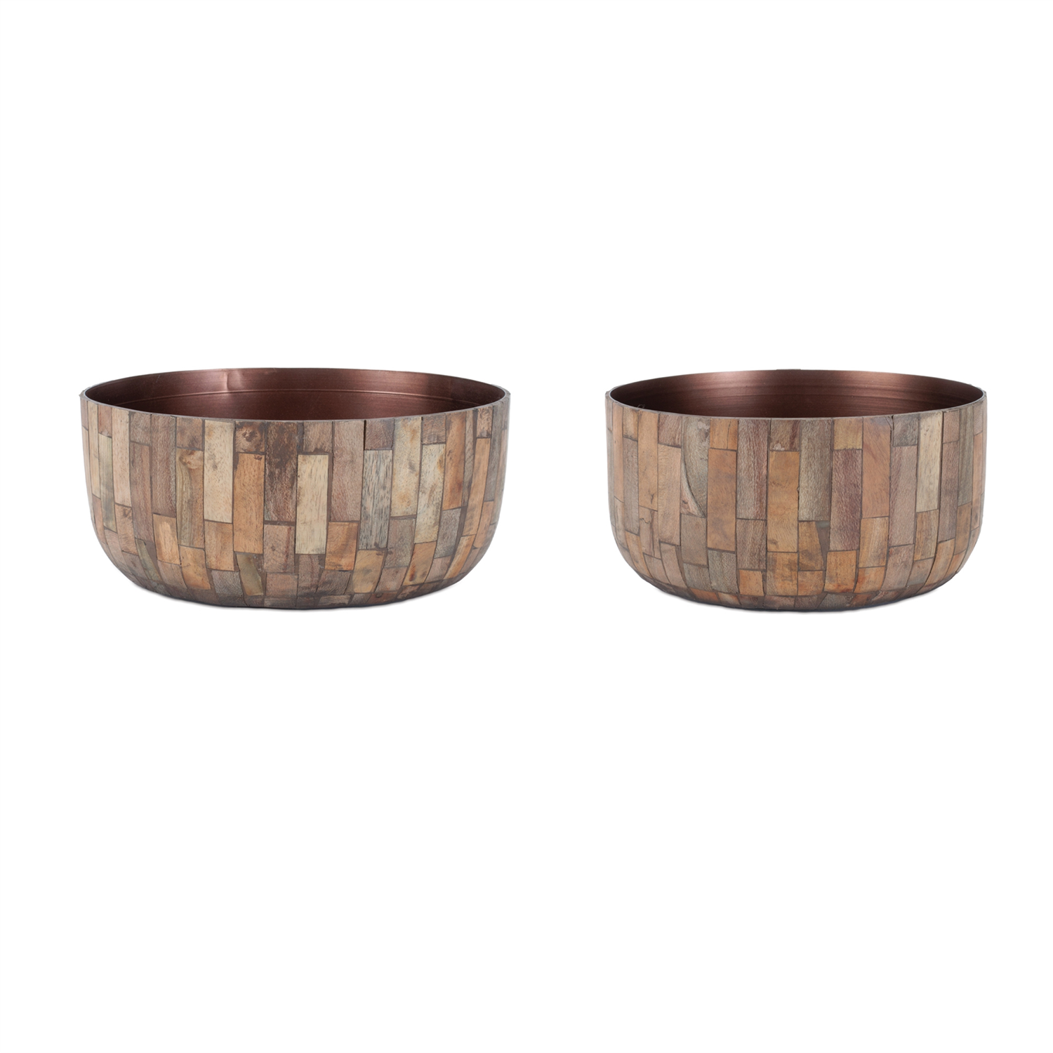 Add natural warmth and contemporary elegance to your space with this set of two round wooden bowl planters. Featuring natural brown tones with beautiful wood grain finishes, each planter is lined with chic bronze metal for a modern touch. These planters, sold in two assorted sizes, are perfect for displaying real or faux potted plants and bringing an earthy, stylish element to your indoor decor. Ideal for modern and contemporary settings, these planters enhance any space with their unique design and versatility.