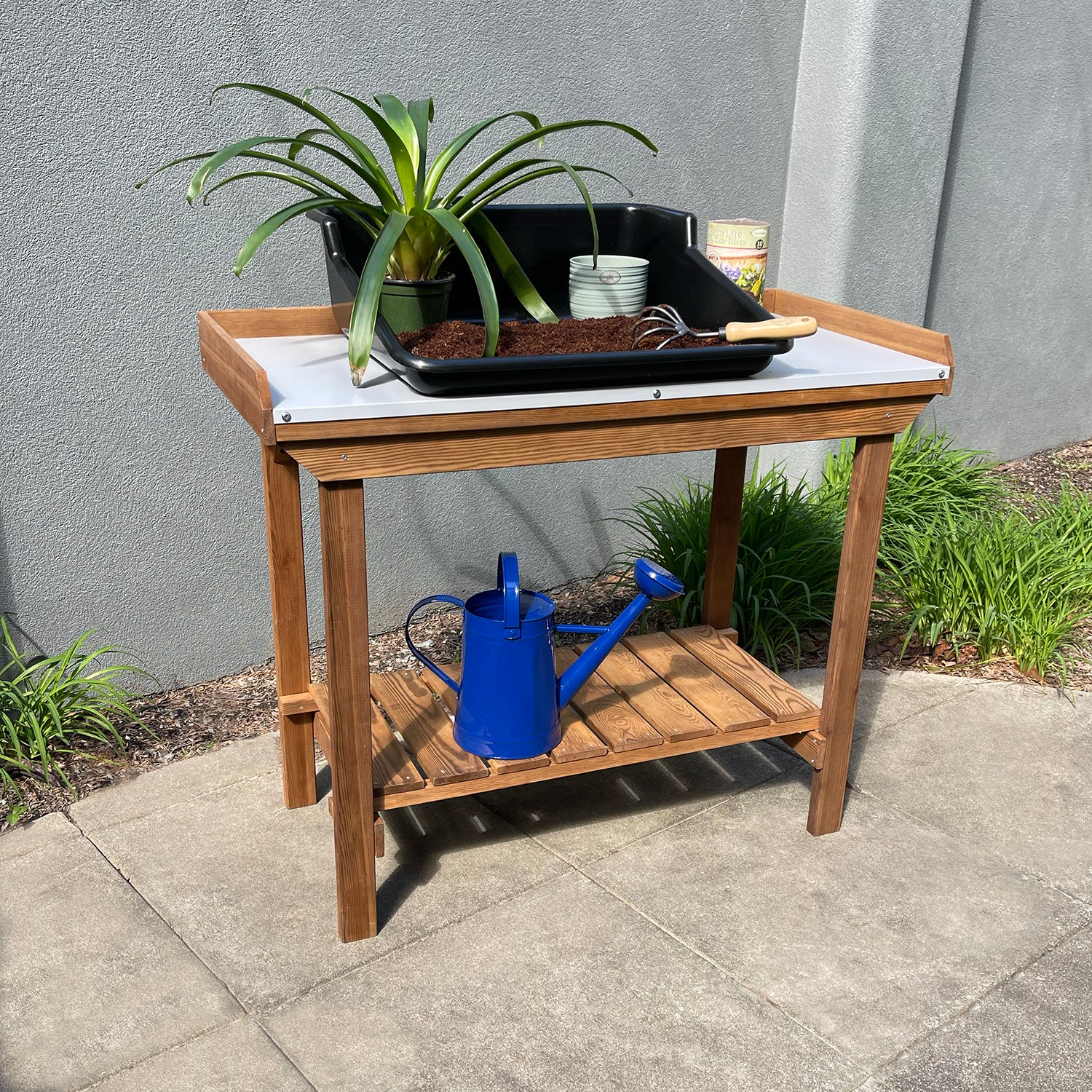 This Gardener's table is ideal for potting plants and transplanting seedlings. Made in Europe of pine and spruce wood harvested from environmentally responsible FSC-certified forests. It is treated for protection against wood and decay. Tin work surface for added protection and bottom shelf for storing tools and planting accessories. 42.5"L x 20.5"W x 36.2"H 38 lbs. 110lb capacity. Pack: 44" x 21" x 6". Assembly required no predrilled holes requires drilling by the end consumer.