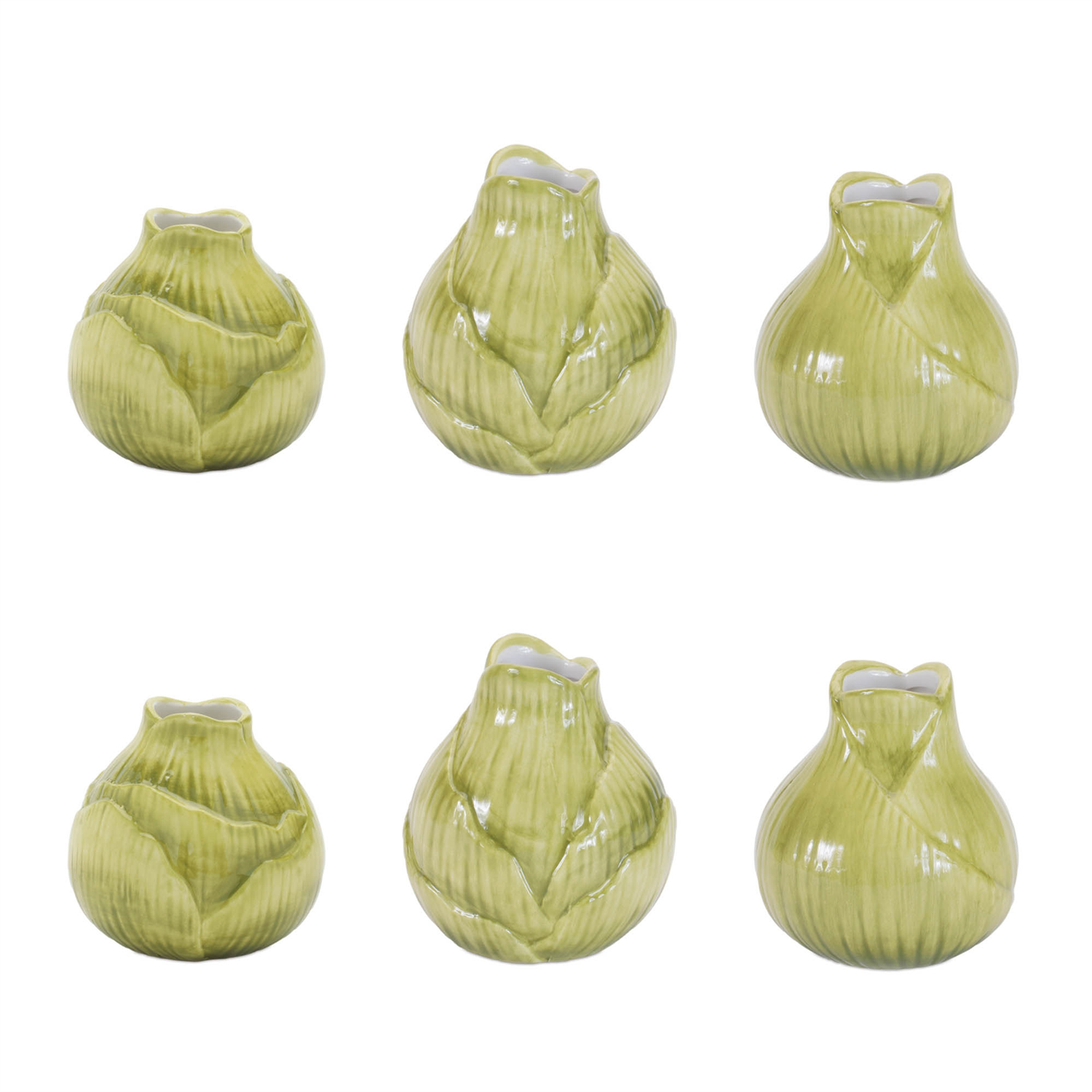 Add a touch of nature to your home with the Stone Flower Bulb Vase. Featuring earthy green tones and a chic glazed finish, these vases are designed in a playful flower bulb shape with a bottle neck opening. Sold in a set of six, with three assorted designs, these vases are perfect for displaying fresh garden stems or as part of a charming decor display. Whether placed on your bookshelf, mantle, or coffee table, they bring a subtle, nature-inspired charm to farmhouse or garden chic style spaces.