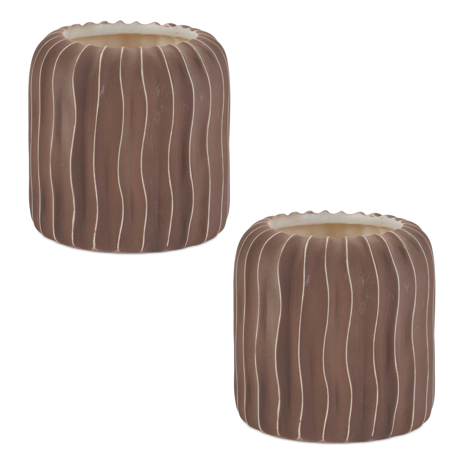 Bring a natural touch to your home decor with the Wavy Ribbed Ceramic Vase set. Featuring earthy brown and beige tones with an unglazed finish, these vases boast a modern wavy ribbed design and a rounded cylinder shape. Sold in a set of two matching pieces, these vases are perfect for displaying on your bookshelf, mantle, or coffee table. Fill them with fresh garden stems or dried florals to add a sophisticated, organic element to your home. These versatile vases are a perfect fit for contemporary or boho-inspired decor.