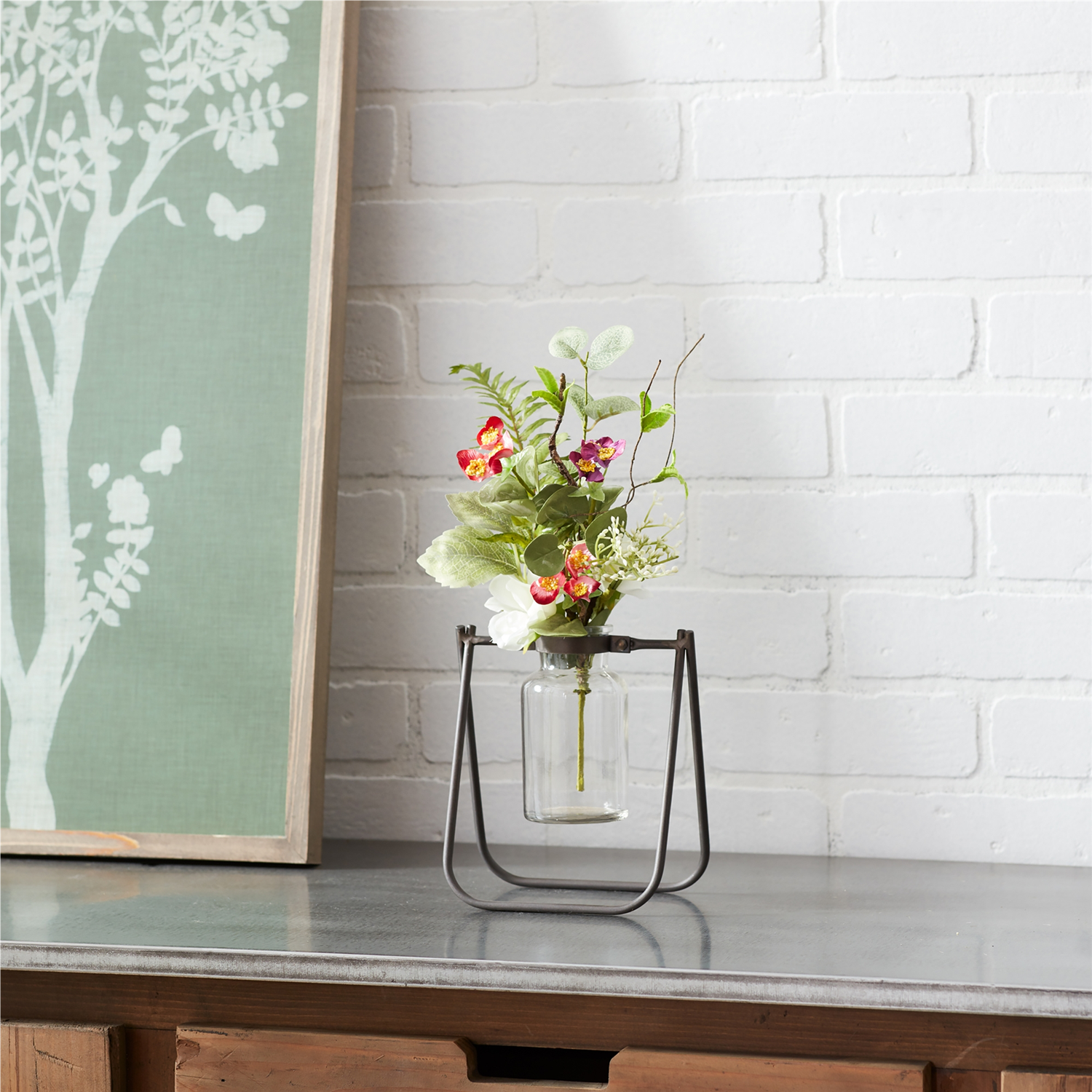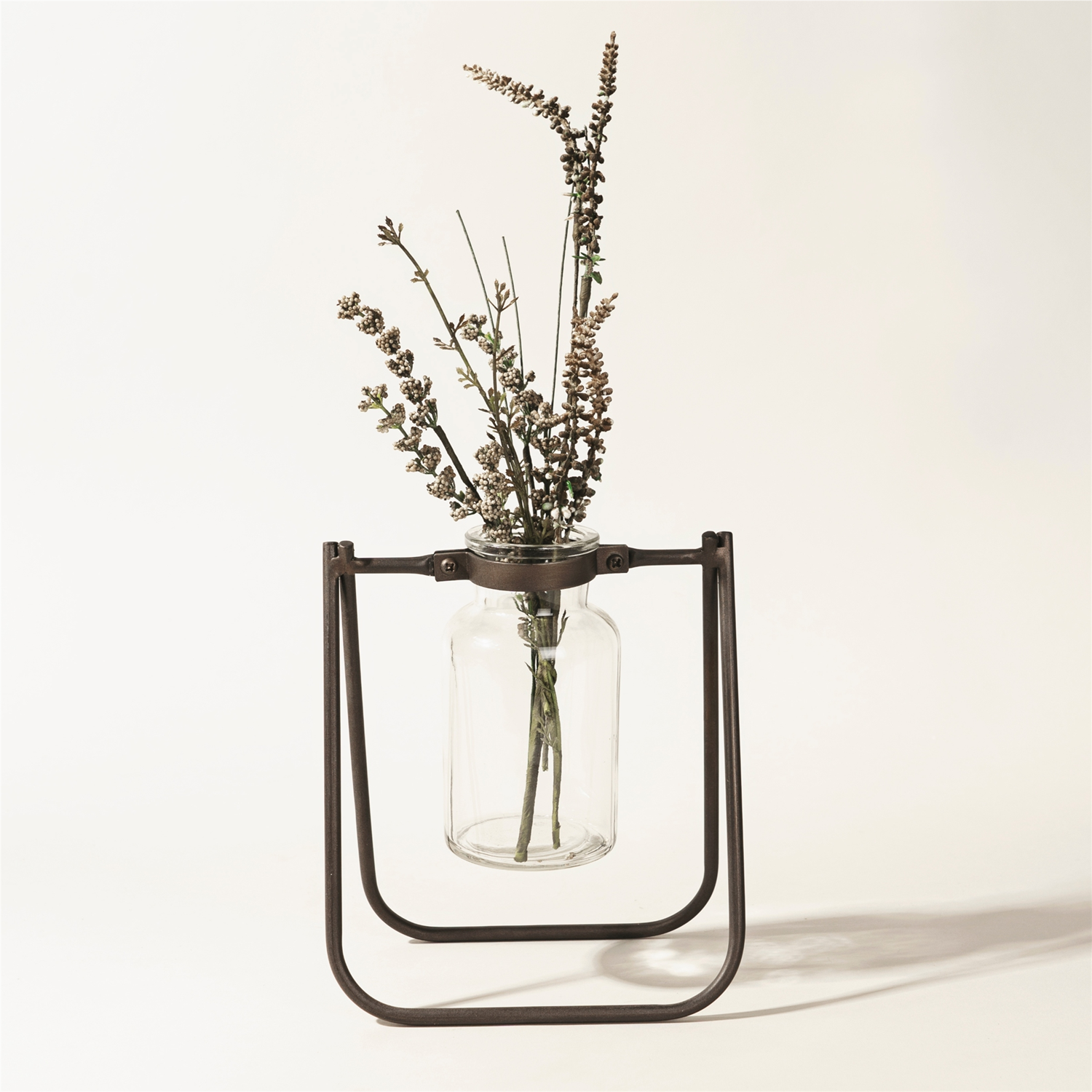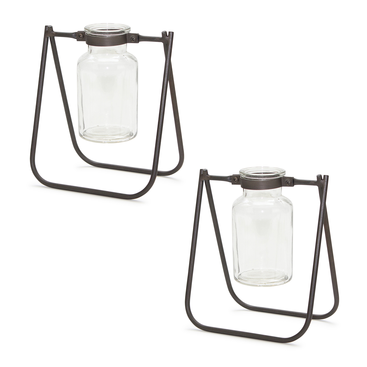Elevate your home decor with the charming elegance of our Hanging Glass Jar Vase with Metal Stand. This pair features a beautifully crafted metal stand in a rustic brown finish, paired with delicate clear glass jars. Perfect for displaying fresh floral buds, faux stems, or other decorative accents, these jars add a vintage touch to any space. Whether for your tabletop, garden nook, or covered outdoor area, this versatile set brings warmth and style to your home with ease. Sold in a collection of two matching pieces to create a balanced and memorable display in your home.