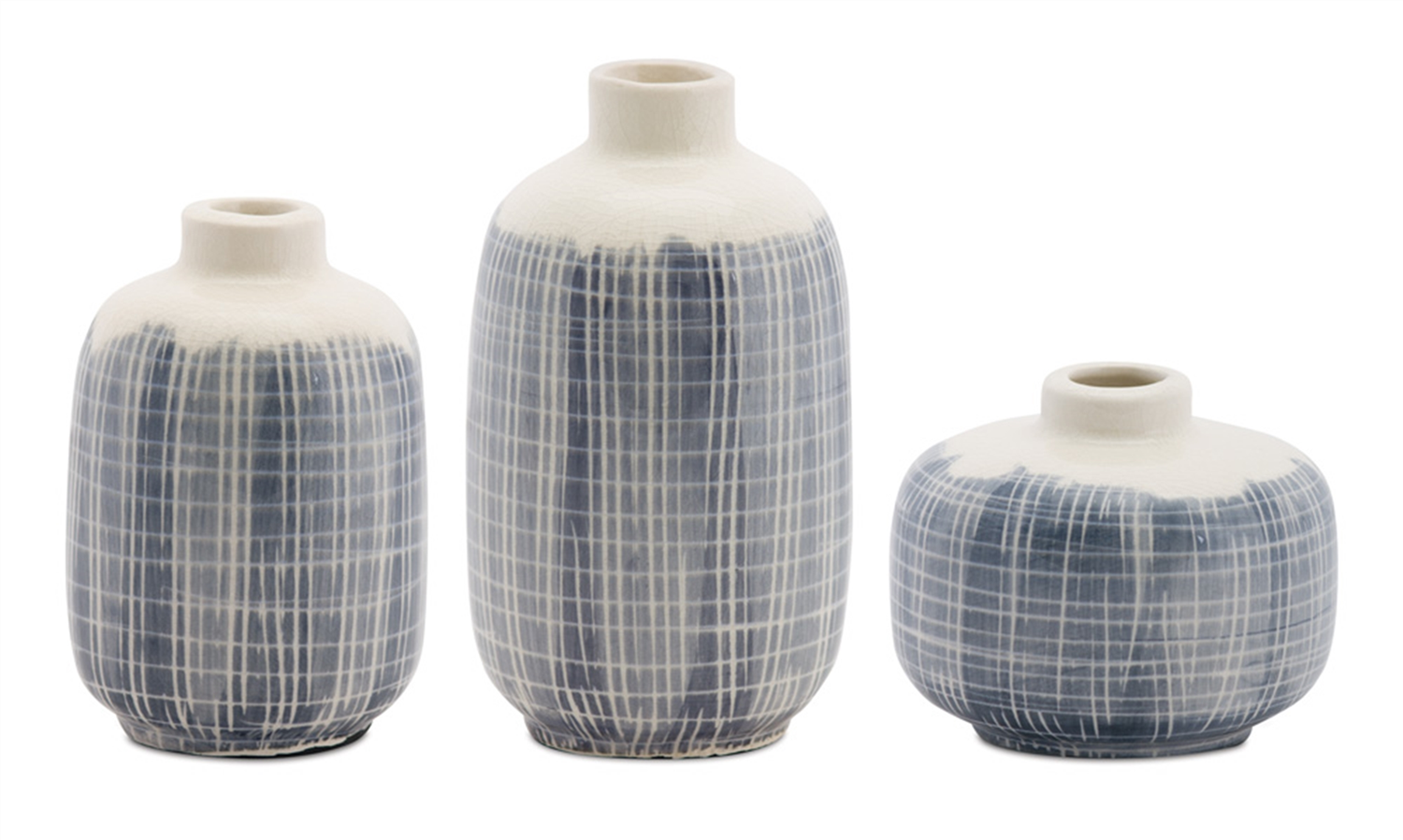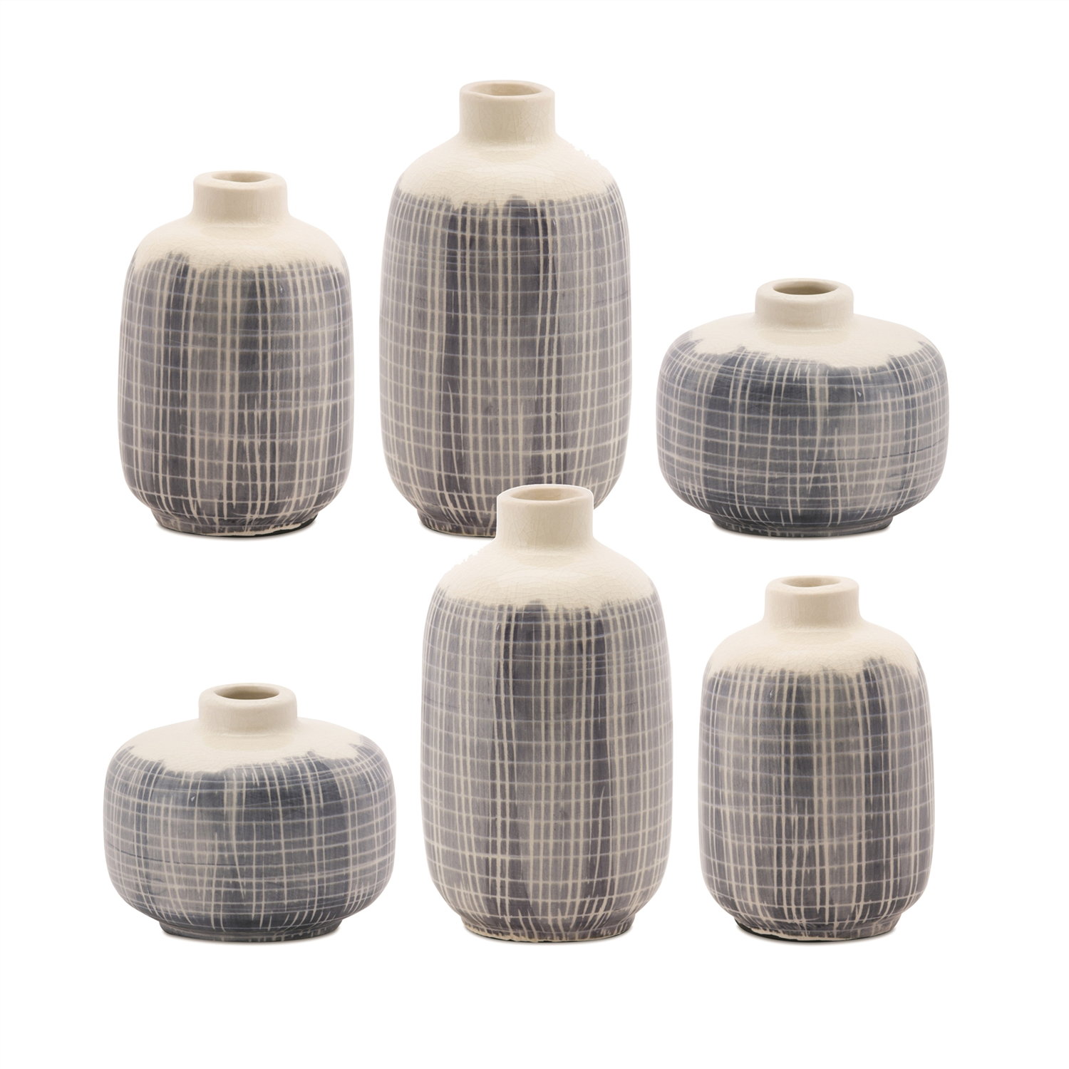 Elevate your space with this elegant 6-piece Mini Terra Cotta Bud Vase Set. Perfect for showcasing fresh floral buds or beautiful faux stems, this collection features three distinct sizes with an eye-catching navy criss-cross pattern on cool blue and ivory tones. Whether you're creating a chic centerpiece or adding a touch of style to any room, these mini vases bring charm and sophistication to your home decor. Add your favorite florals and let these vases speak for themselves!