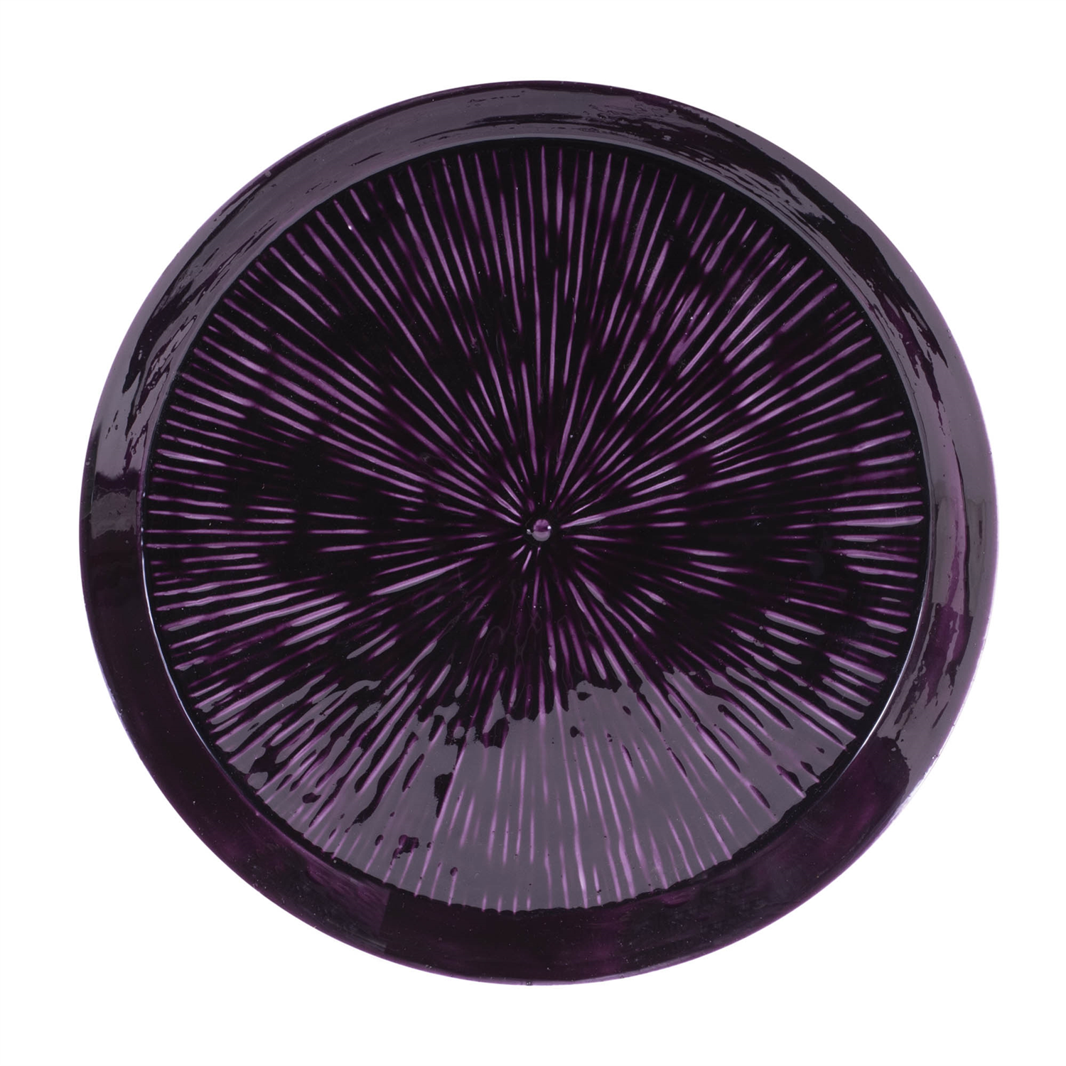 Add a bold splash of color and elegance to your space with this round etched metal tray. Featuring cool plum purple tones with a distressed painted design and glossy glazed finish, this tray brings a sophisticated yet vibrant touch to your home. The modern textured starburst design enhances its visual appeal, making it perfect for displaying on your coffee table or end table with vases, candles, or novelty decor. Alternatively, use it in your kitchen to showcase fresh fruit or sweet treats when entertaining guests. A versatile piece that complements any style of decor with its chic and eye-catching design.