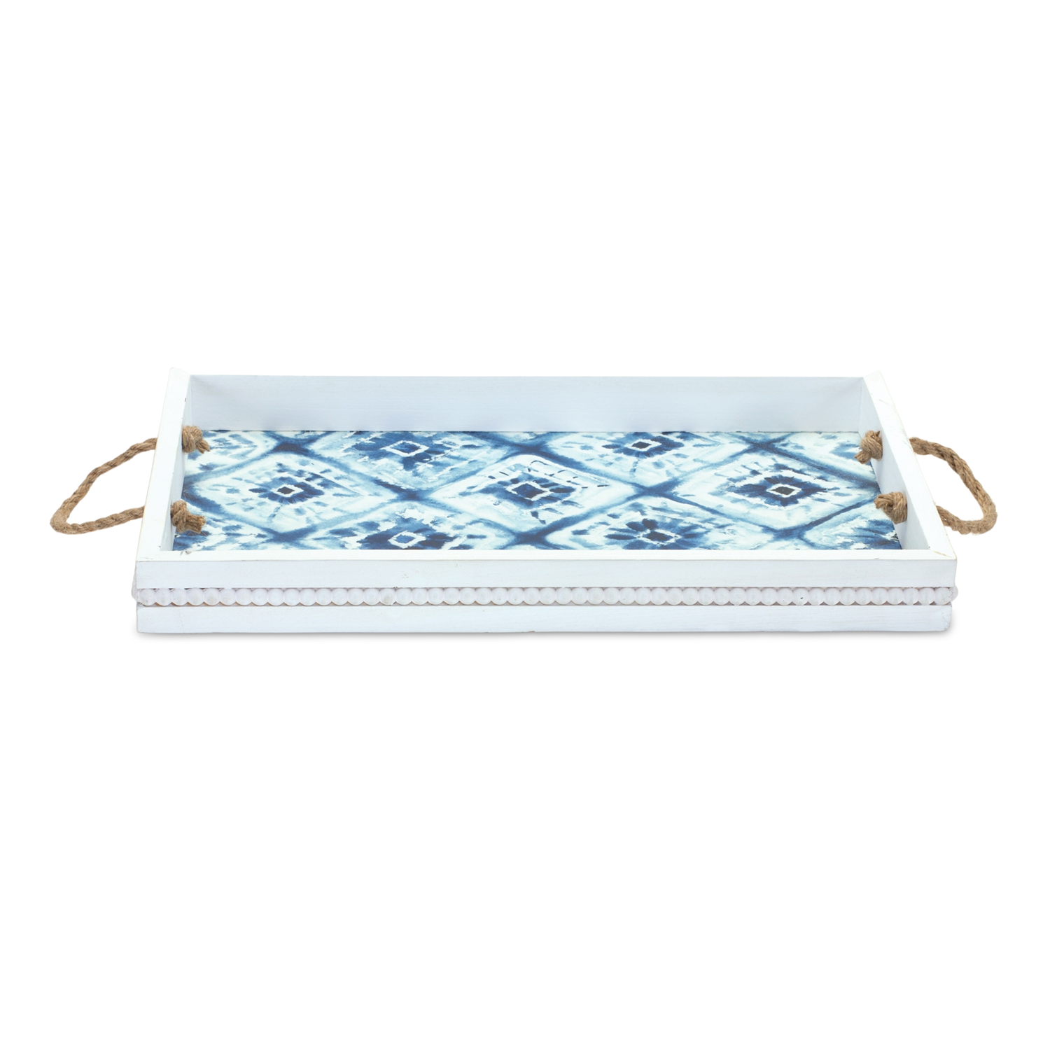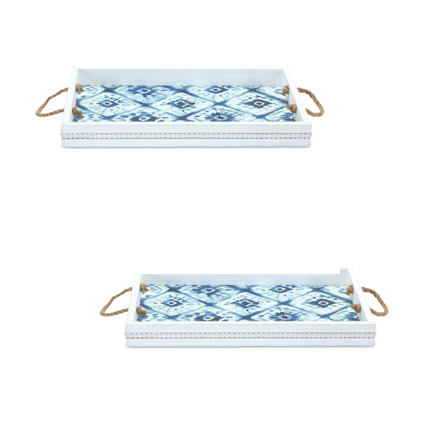 Elevate your home decor with the Wooden Tie-Dye Design Tray Set. This pair of trays features a stunning blue tie-dye pattern set against a bright white finish, complemented by charming rope accents. Perfect for displaying LED candles, faux florals, or accent pieces, these trays add a coastal or boho vibe to any space. Crafted from durable wood, they make a functional yet stylish addition to your home, ideal for accentuating both modern and coastal decor styles. Sold in a set of two matching pieces to create a balanced and memorable display in your home.