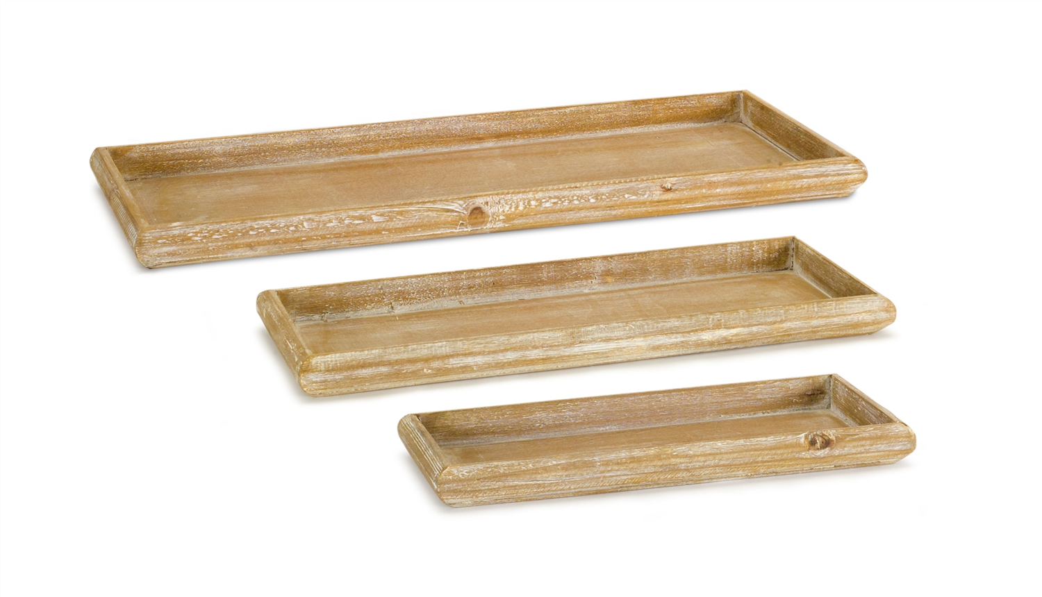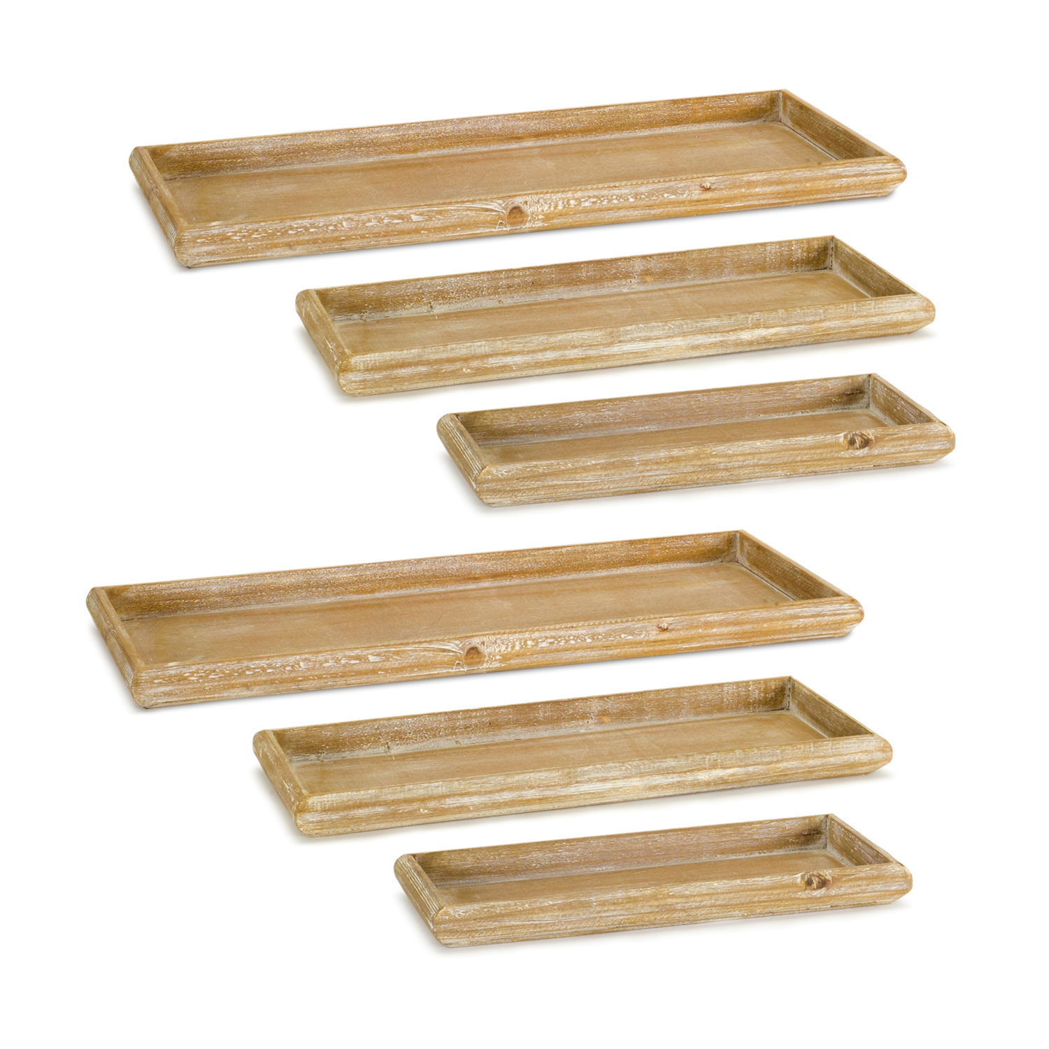 Bring a touch of rustic charm to your home with this Set of Natural Wooden Nesting Trays. These whitewashed trays effortlessly blend with a variety of interior styles—from farmhouse to coastal. Whether used to display LED candles, faux florals, or curated centerpieces, these trays add layered texture and stylish functionality to your tabletops and shelves. Perfect for creating a cohesive look across your living room, dining area, or entryway. Sold in a set of six pieces with three assorted sizes to create a memorable display in your home or event space.