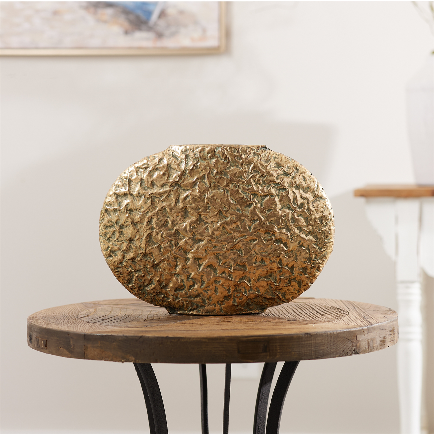Add a touch of modern elegance with the Distressed Flat Metal Vase Set. Featuring a chic gold tone with a metallic finish, these vases showcase a distressed texture that perfectly complements their contemporary flat shape. Sold in a set of two matching pieces, these vases are ideal for adding a luxurious touch to your decor. Whether displayed on your bookshelf, mantle, or as a centerpiece on your coffee table or end table, they create a stunning focal point, especially when filled with dried florals or pampas stems. The perfect choice for contemporary or luxury glam style homes.