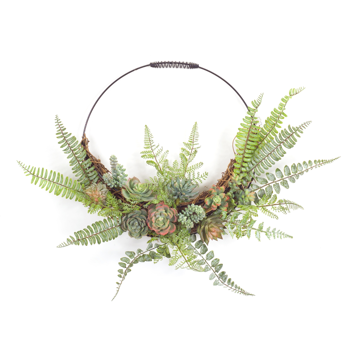 Bring the outdoors inside with this Fern and Succulent Moss Half Wreath Wall Decor. Designed to brighten up any room, this vibrant wreath features an expertly crafted mix of realistic fern foliage and variegated succulents, set against a durable wire and grapevine base. Ideal for adding a touch of greenery to your home, it's perfect for both your front door or as a charming wall accent. Crafted from high-quality plastic, this wreath will stay vibrant for seasons to come, enhancing your indoor decor with natural beauty and color.