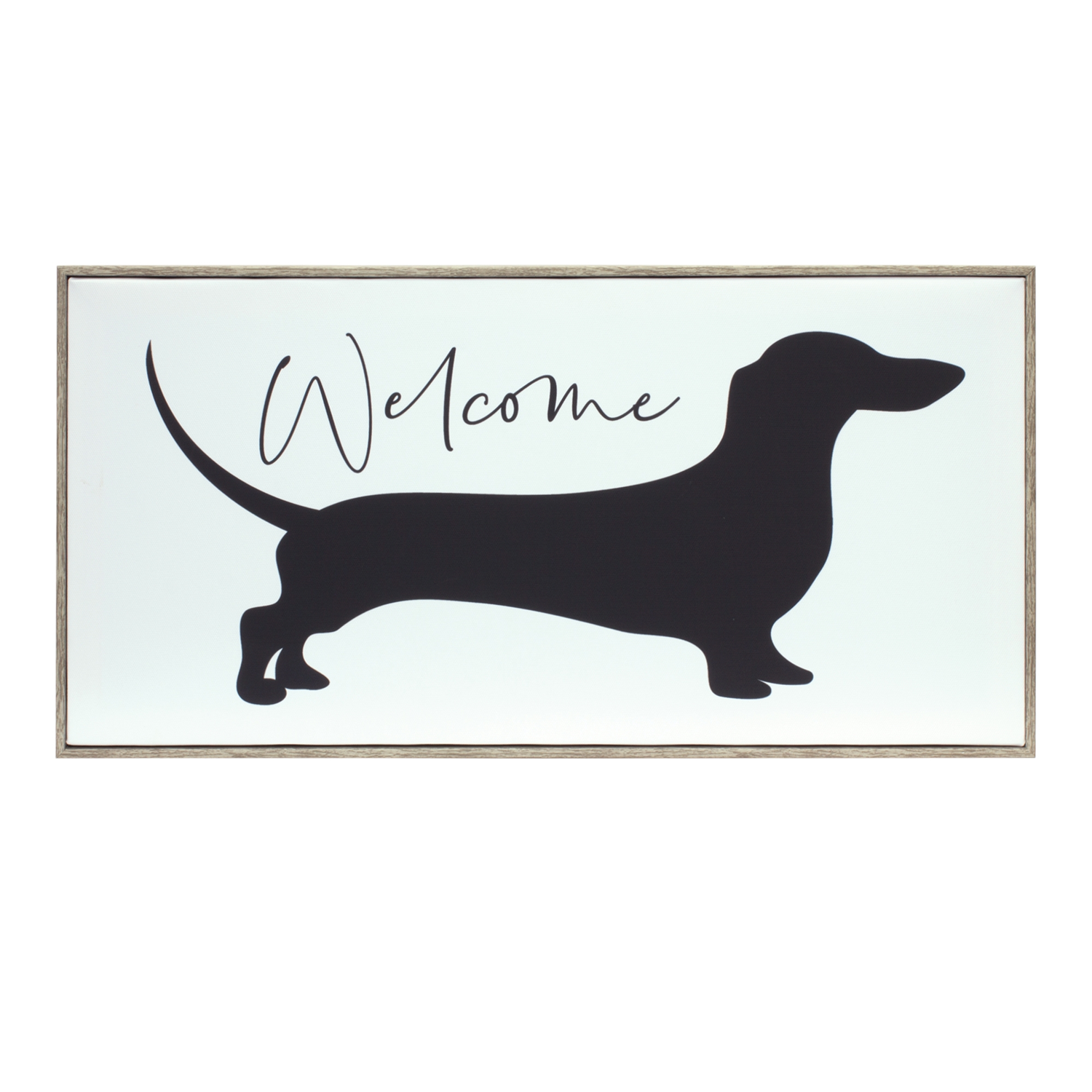 Welcome guests with charm and canine-inspired style using this Wood Framed Dachshund Welcome Sign. Featuring a playful dachshund silhouette and a clean “Welcome†sentiment, this wall decor piece brings a warm, whimsical touch to any space. The sleek black and white design is accented by a natural-look faux wood frame, making it an effortless addition to your entryway, hallway, or living room.