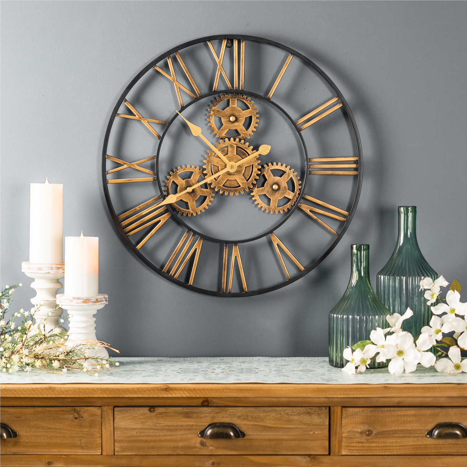 Enhance your space with the bold elegance of our Industrial Iron Gears Wall Clock. Featuring a striking black and gold finish, this 23.75-inch statement piece seamlessly blends vintage industrial charm with modern sophistication. The exposed-gear design and classic Roman numeral face create a timeless aesthetic, making it the perfect accent for living rooms, offices, or entryways. Crafted from durable iron metal, this clock is built to last. Battery-operated for easy installation (requires 1 AA battery, not included).