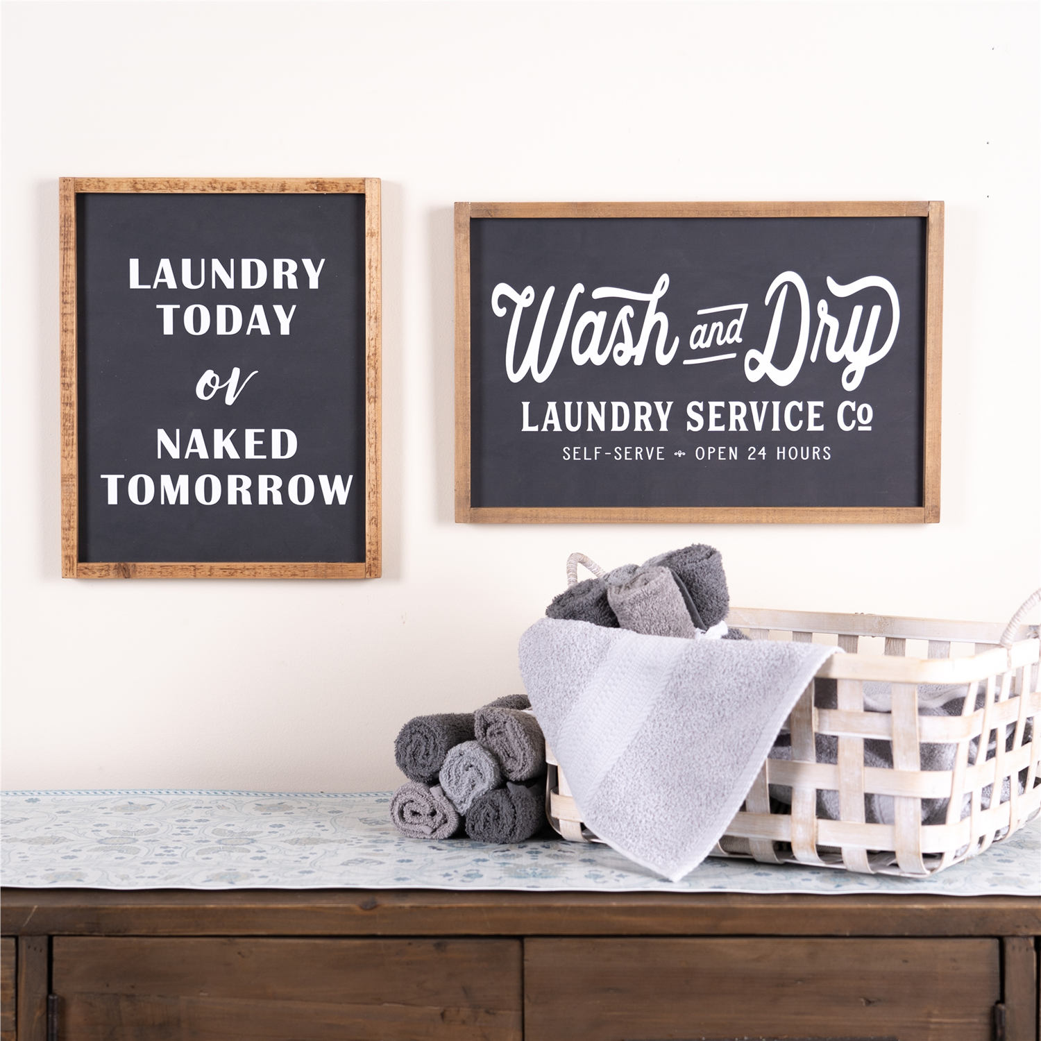 Bring humor and charm to your laundry space with this whimsical laundry room sign. Featuring the cheeky phrase "Laundry Today or Naked Tomorrow," this black, white, and brown wall decor adds a fun twist to your daily routine. Crafted from durable MDF and framed in quality fir wood, this sign blends perfectly with modern farmhouse, rustic, or contemporary interiors. Whether you're sprucing up your laundry nook or adding personality to a utility area, this sign is a playful and stylish finishing touch.