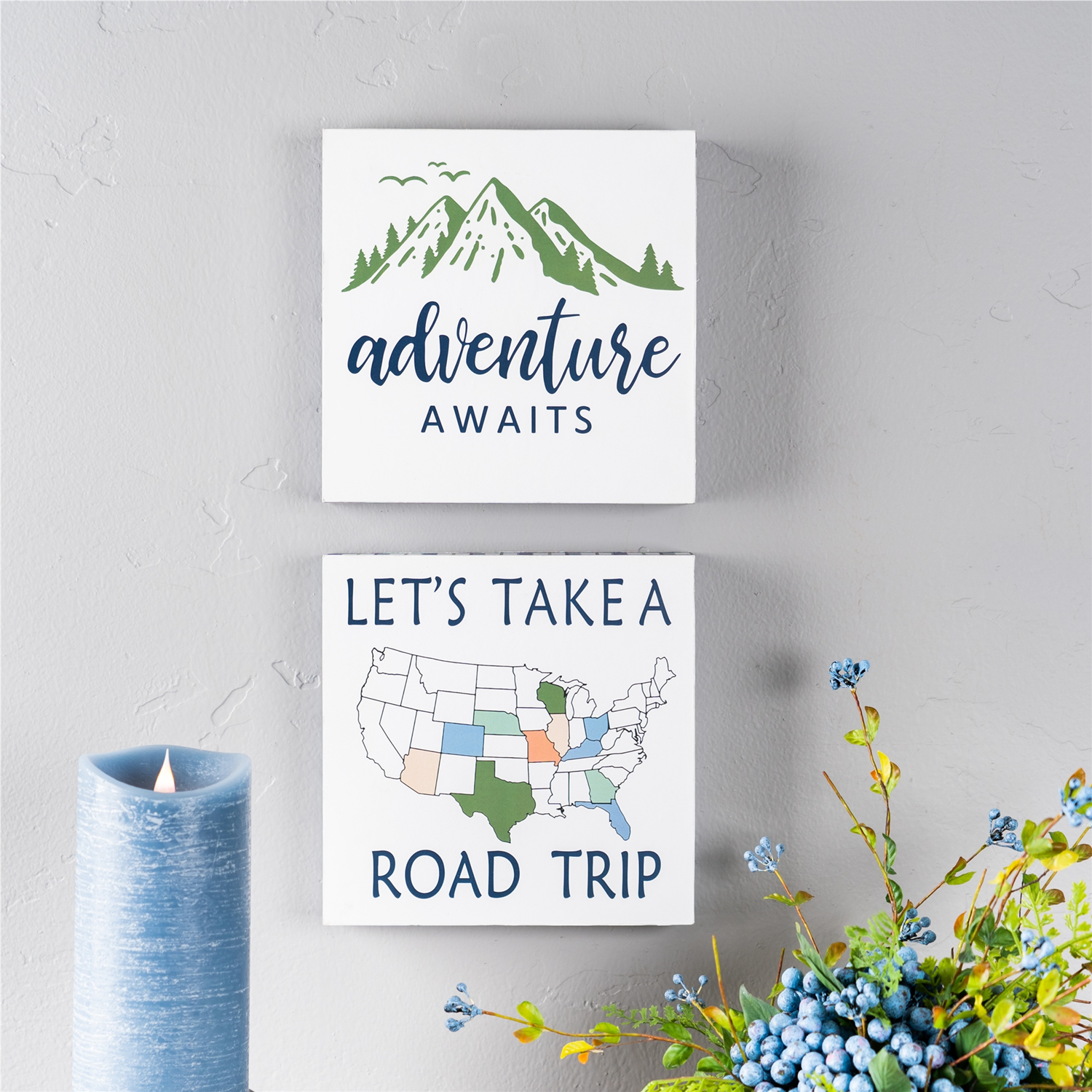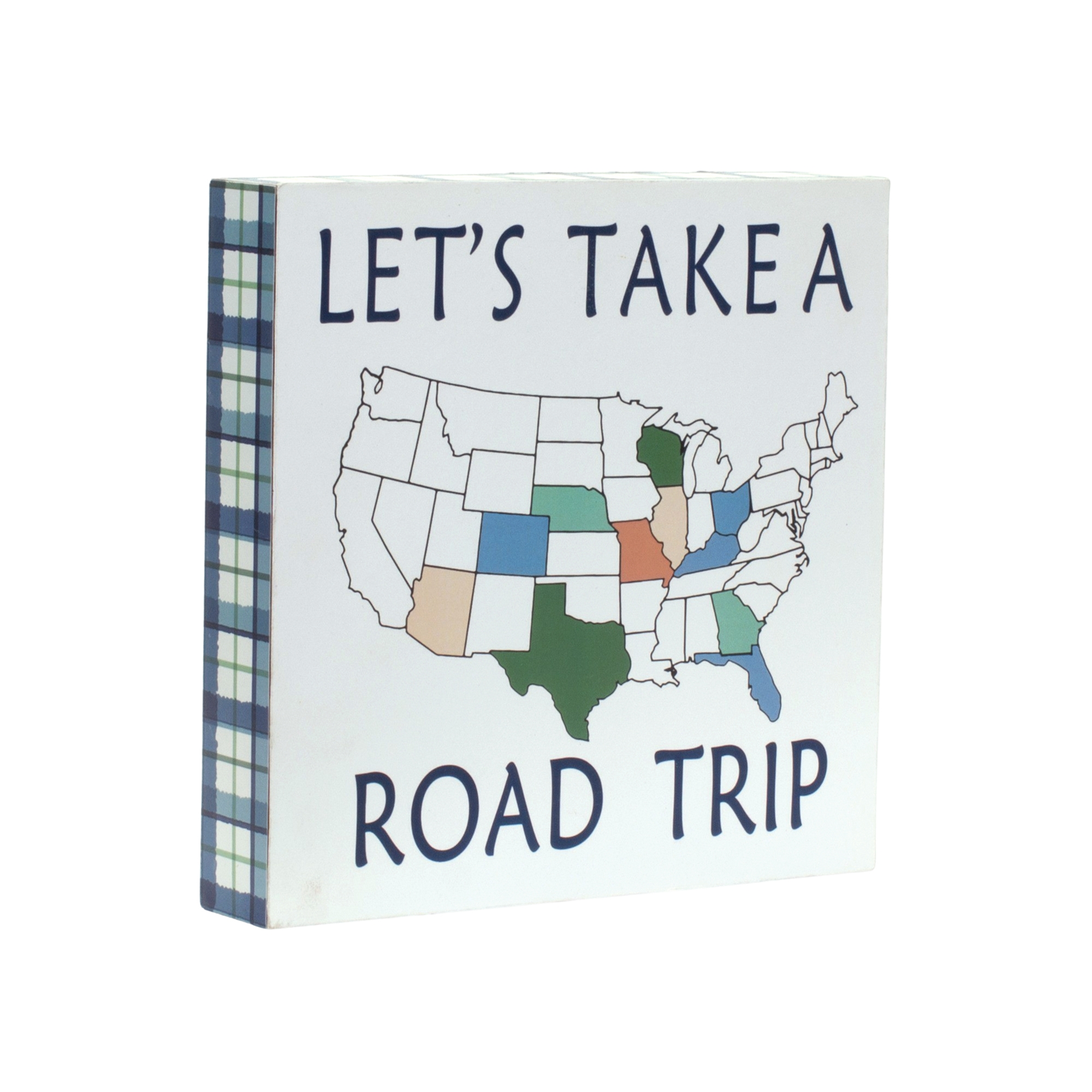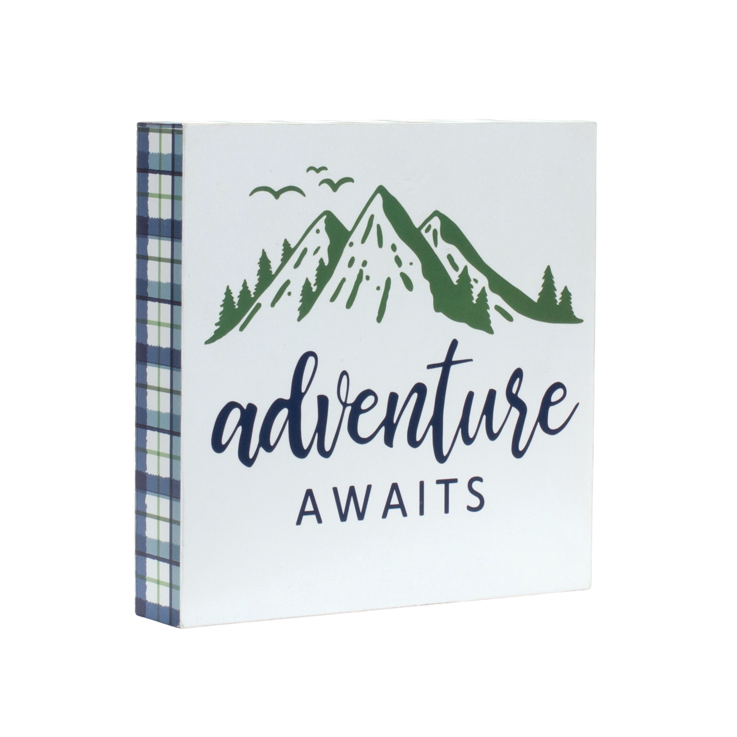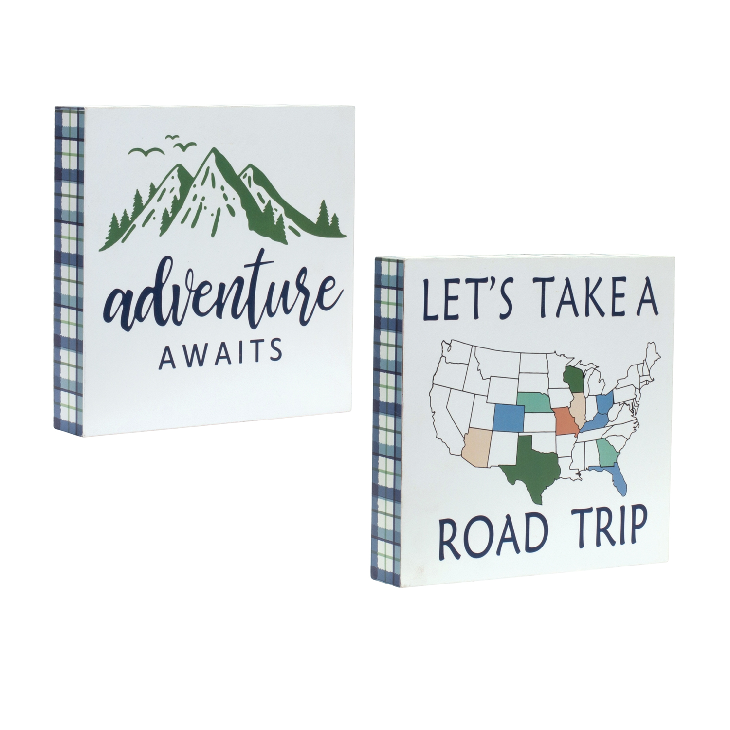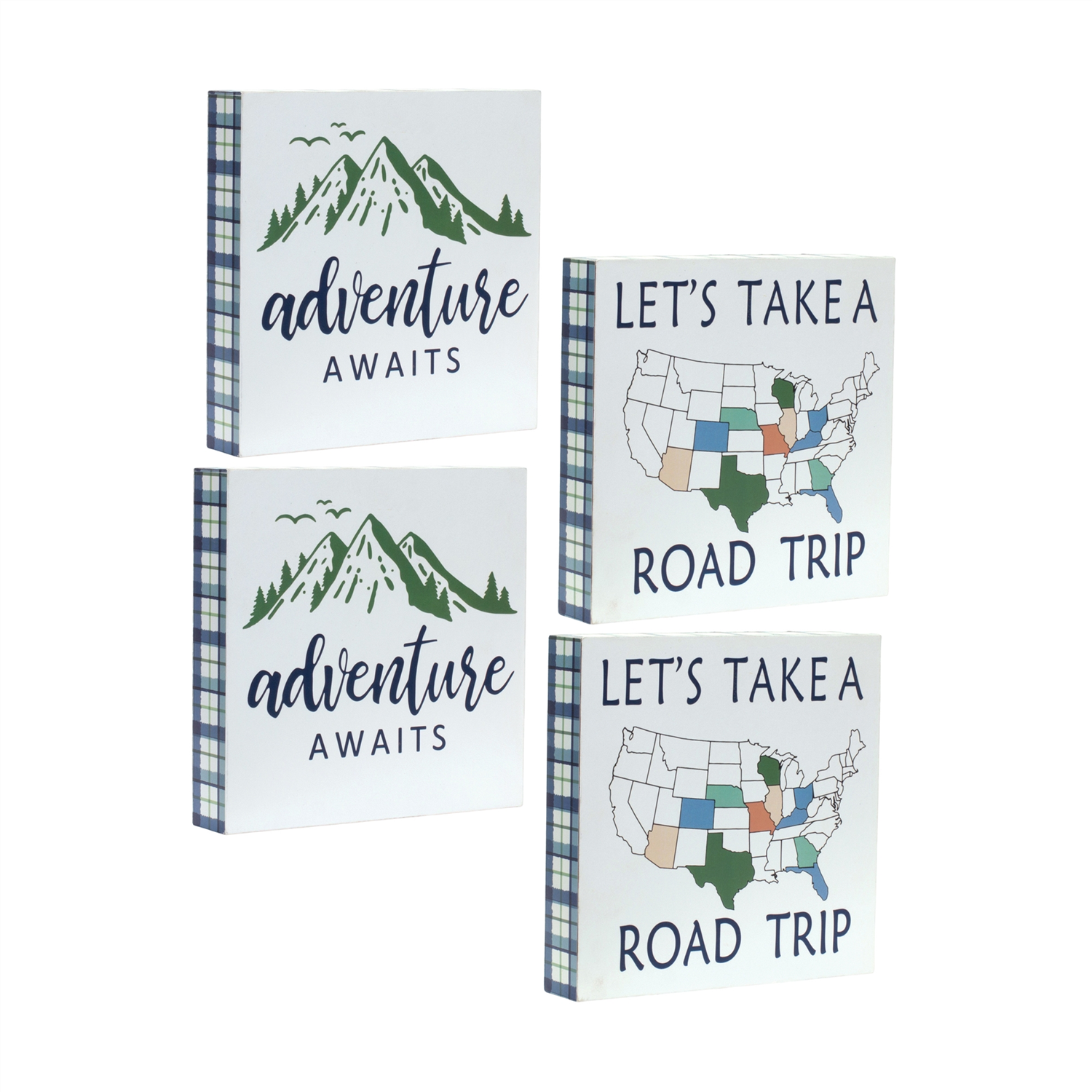 Add a touch of wanderlust to your walls with this set of Adventure Sentiment Signs. Designed with charming rustic details like plaid borders, mountain motifs, and global map accents, these decorative blocks feature the inspiring quotes "Adventure Awaits" and "Let's Take a Road Trip". Crafted from durable MDF, each 8" square piece brings cozy cabin vibes or a travel-inspired twist to any space. Perfect for entryways, living rooms, or home offices, this set is a must-have for adventurers at heart. Sold in a collection of four pieces with two assorted designs to create a balanced and memorable display in your home.