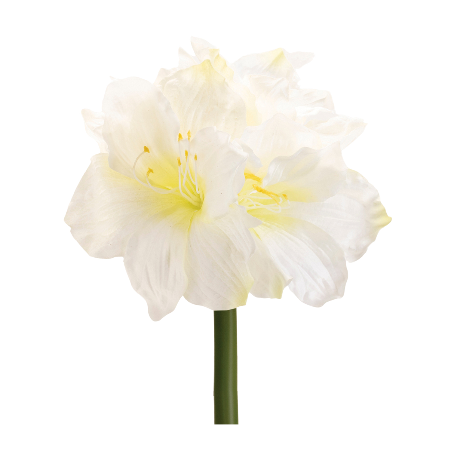 Bring timeless beauty into your home with this exquisite set of 6 Amaryllis stems. Each bloom is meticulously crafted to capture the delicate charm of real flowers, featuring soft white petals kissed with hints of yellow and supported by lush green stems. Standing tall at 28 inches, these lifelike florals add a graceful touch to any space – no watering required.