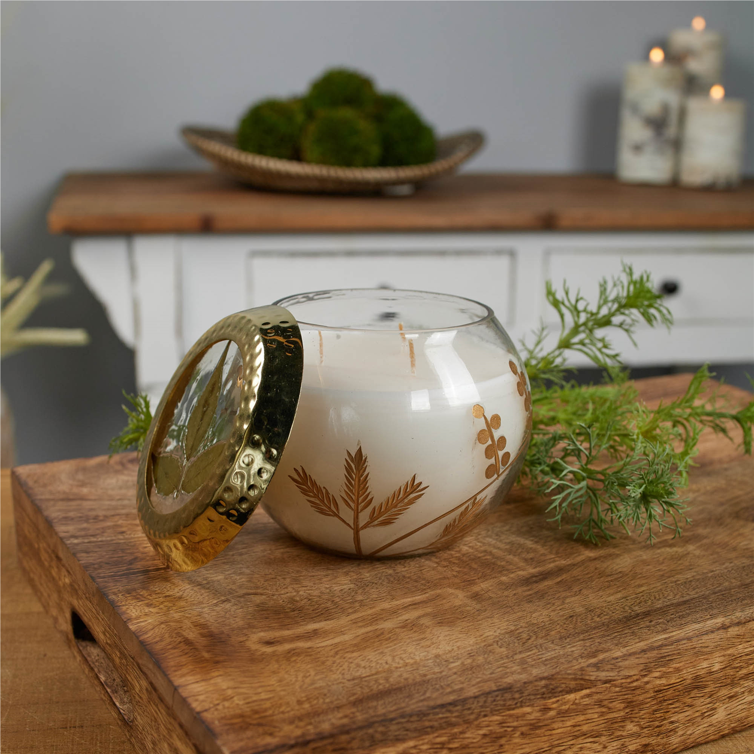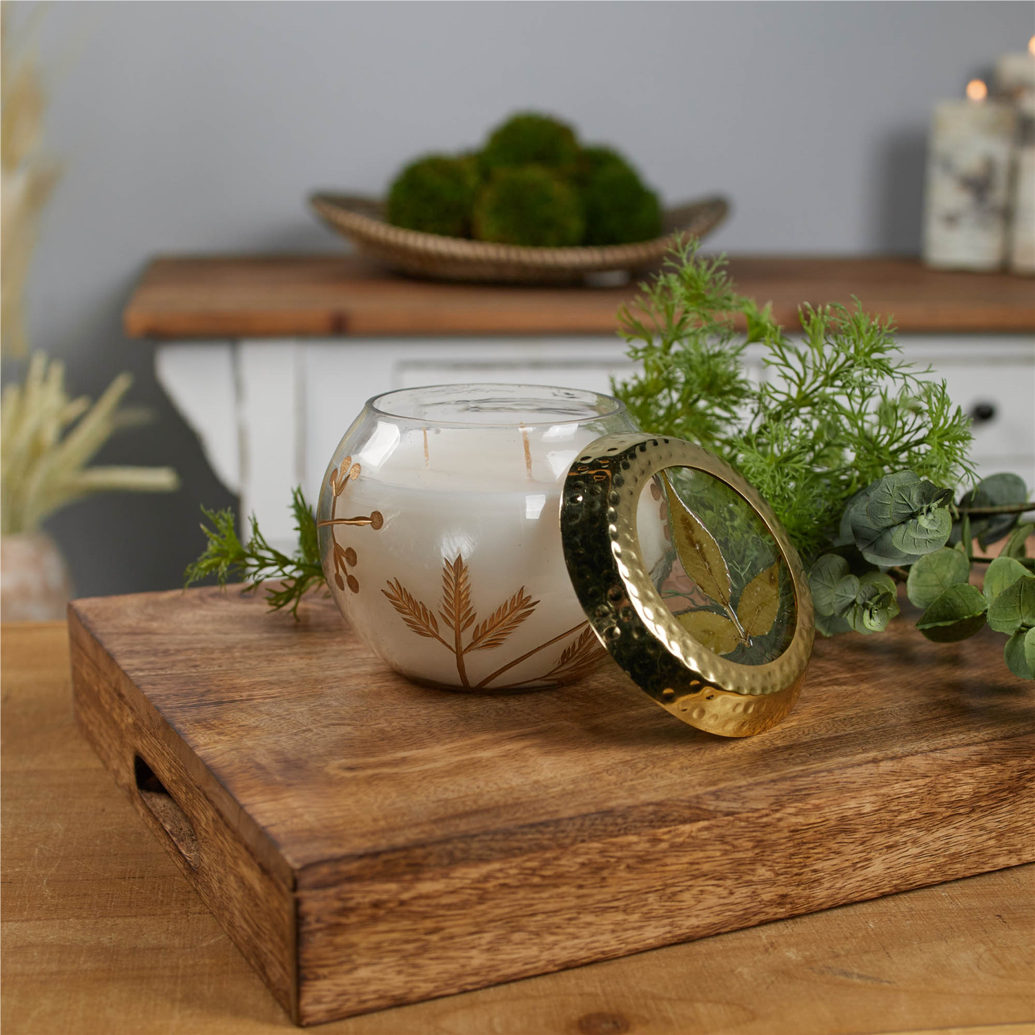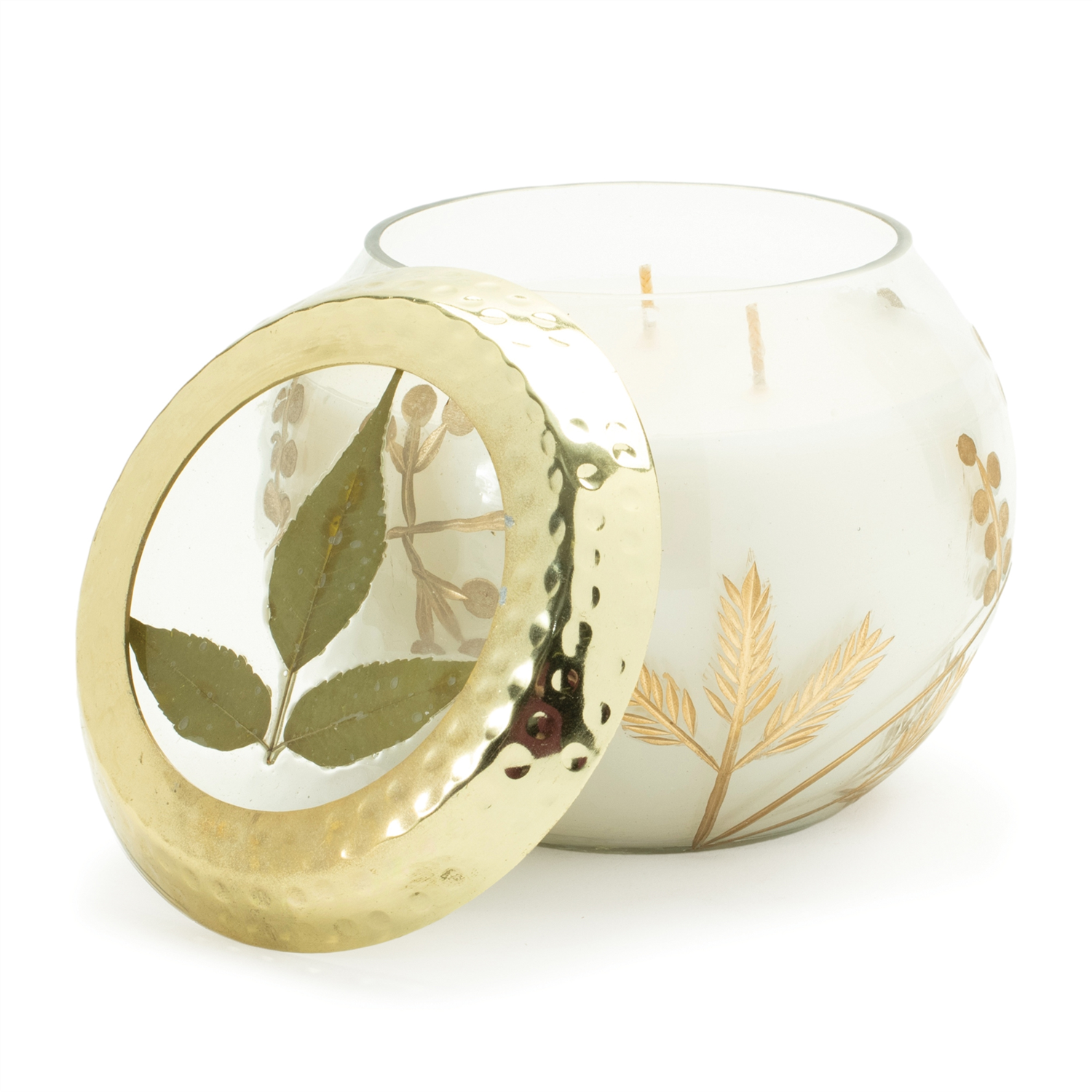 Immerse your home in the festive scent of Frosted Juniper with this Scented Soy Candle. Made with a blend of paraffin and soy wax, it offers a clean, long-lasting burn. The round glass holder is adorned with a gold etched foliage and berry design, giving it a chic, seasonal look. The pressed leaf lid adds a natural touch, while the two wicks ensure an even, consistent burn. This candle is perfect for cozying up your living space or gifting to loved ones during the holidays.