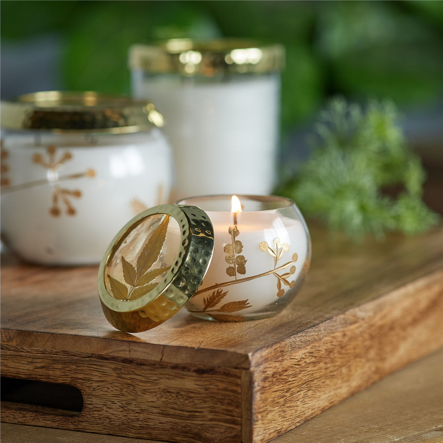 Add a festive touch to your home with the Frosted Juniper Scented Soy Candle Set. Each candle is made with a blend of paraffin and soy wax, offering a clean and long-lasting burn. The round glass holders are beautifully adorned with gold etched foliage and berry designs, creating a sophisticated, seasonal vibe. The pressed leaf lids provide a unique and natural accent. Each candle features a single wick for a consistent burn. This set of three matching candles is perfect for gifting or enhancing your holiday decor.