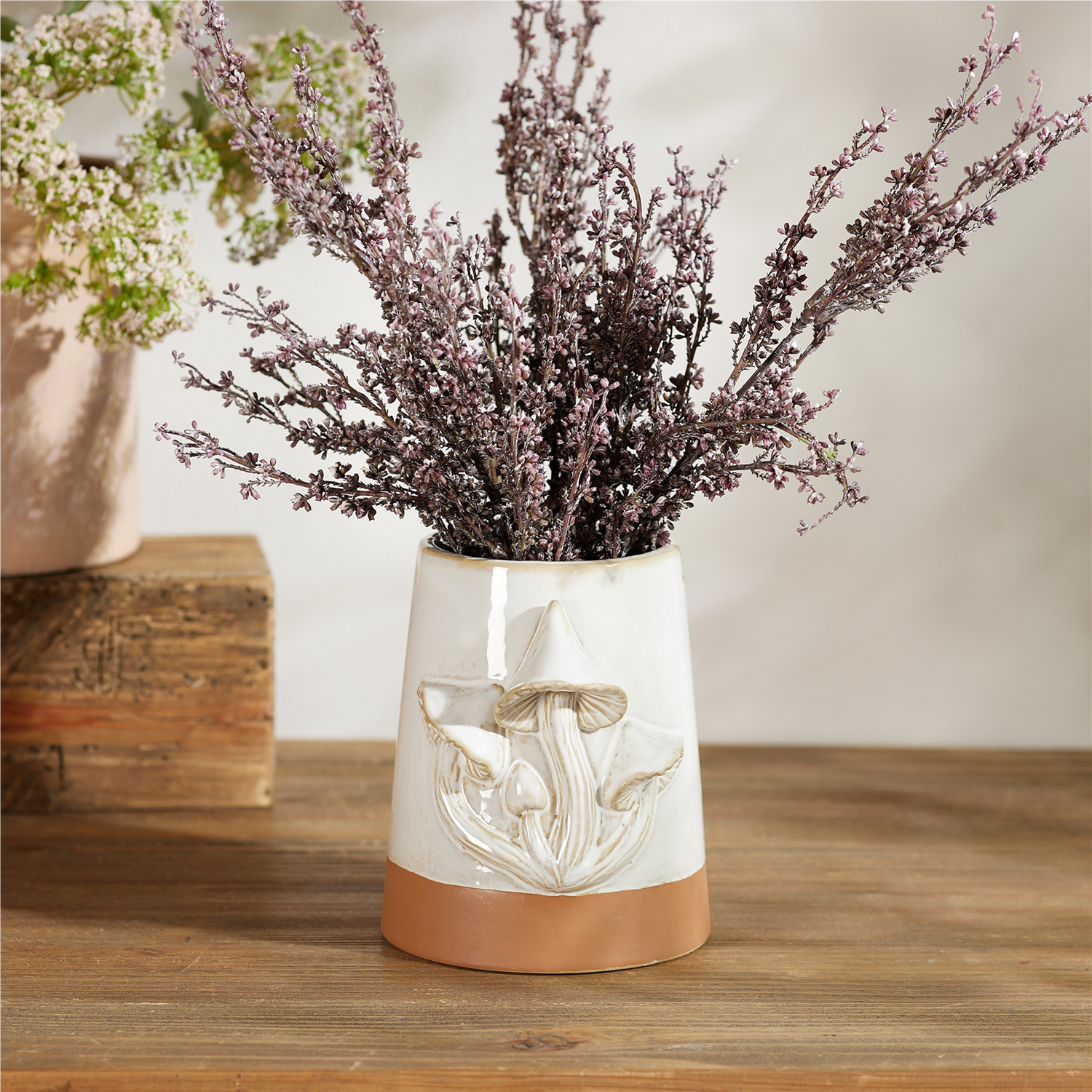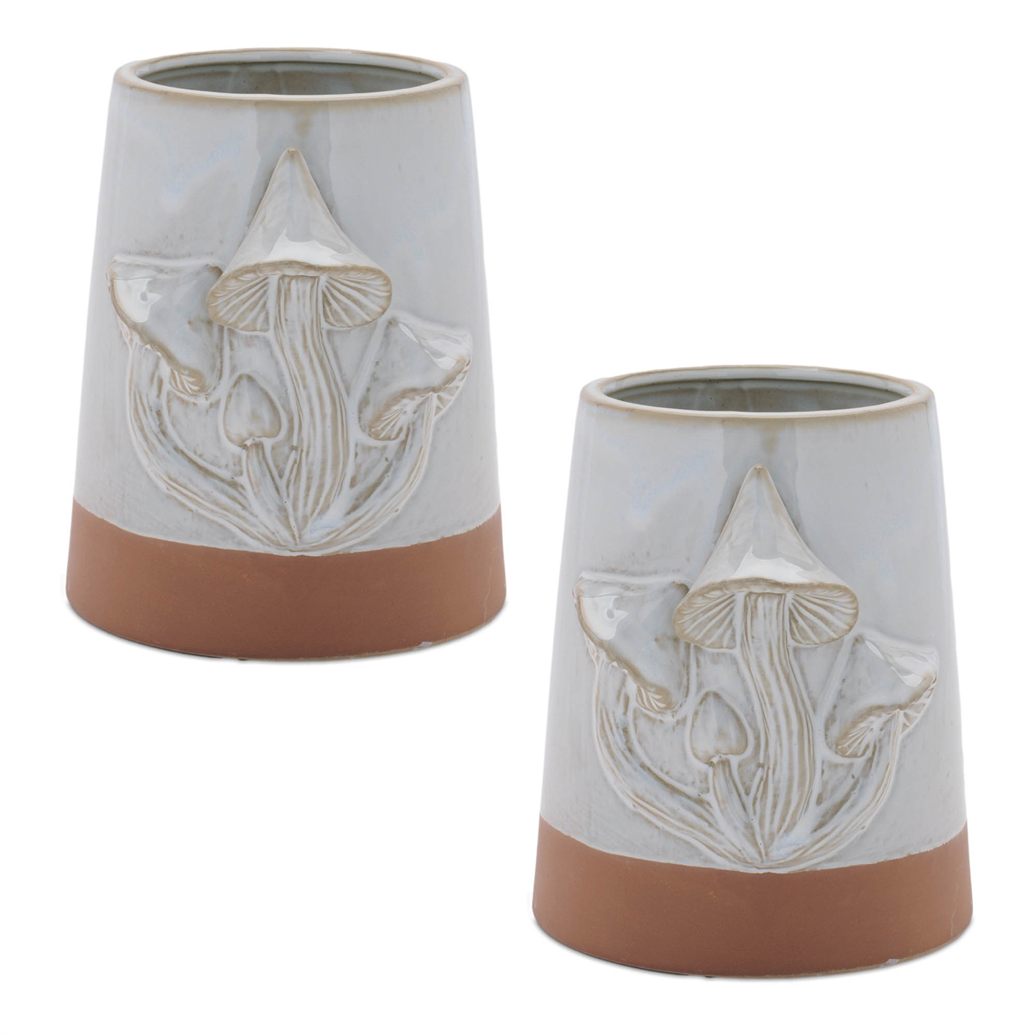 Bring a touch of the woodland into your home with the Tapered Porcelain Planter with Mushrooms Set. Featuring a cool grey and brown tone with a glazed finish and unglazed bottom accent, these planters beautifully showcase the intricate woodland mushroom design. Sold in a set of two assorted designs, these planters are perfect for adding an earthy, nature-inspired touch to any space. Whether you're displaying real or faux plants, they are suitable for both indoor and outdoor covered use.