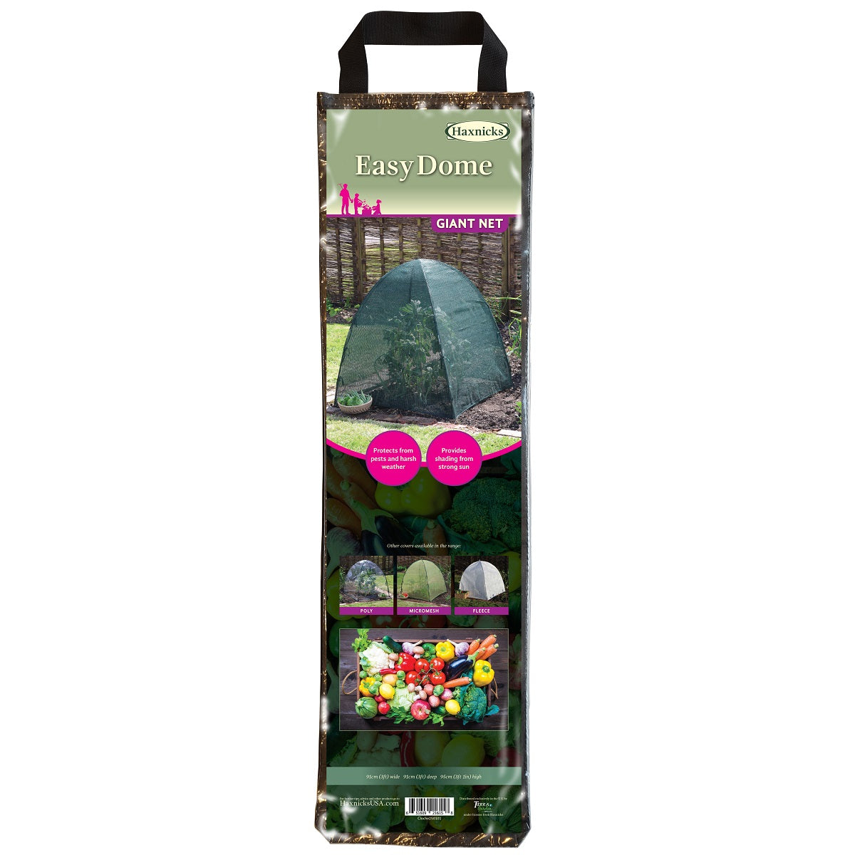Offers shade protection from intense sunlight preserves moisture and safeguards against insects birds and animals. Constructed from UV-stabilized high-density 5mm mesh polyethylene with rust-resistant galvanized steel hoops. Comes with ground pegs. Dimensions: 36"L x 36"W x 37"H 2.5lb