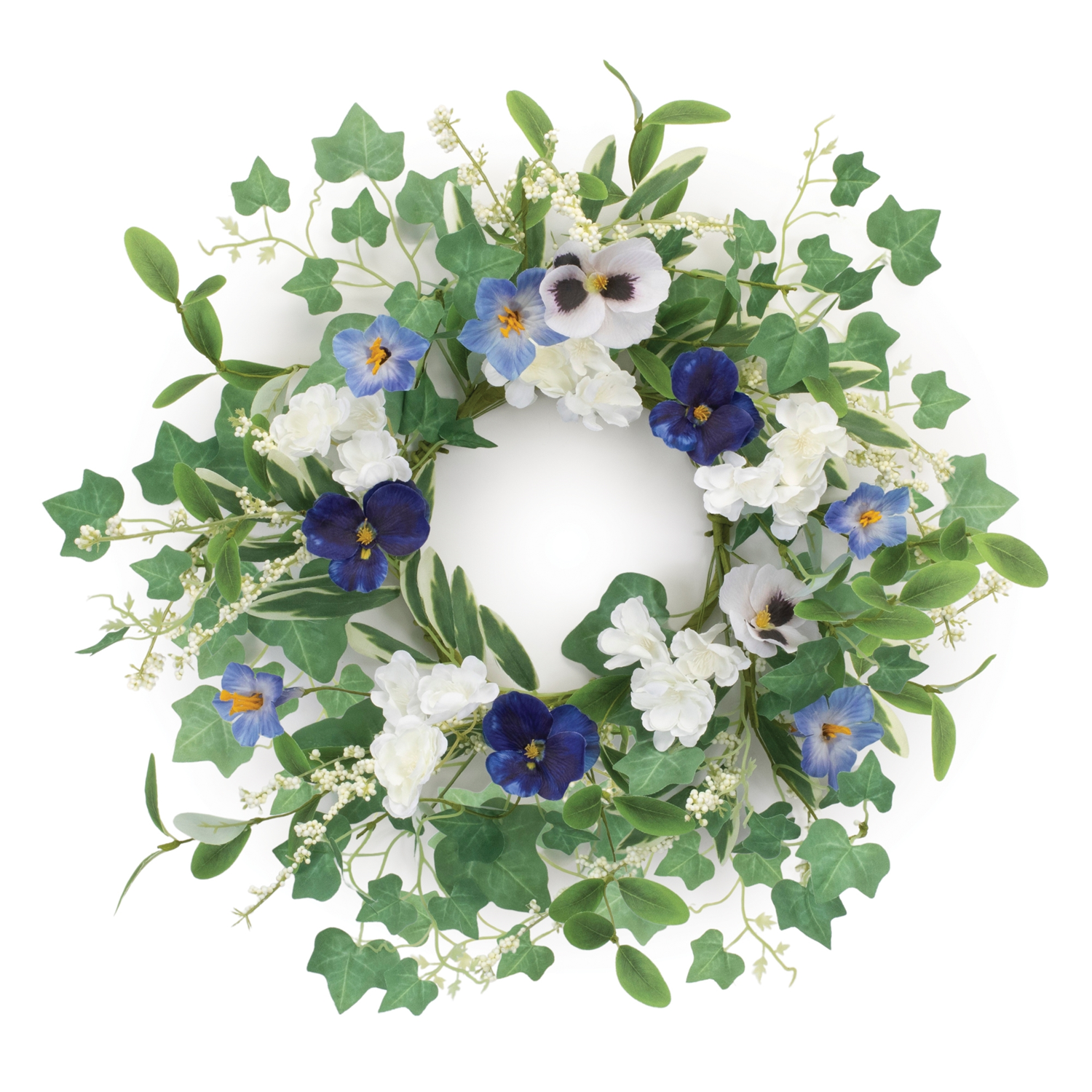 Bring a burst of vibrant color and natural beauty into your home with the Mixed Petunia and Pansy Candle Ring. This faux floral centerpiece features a stunning blend of blue and purple petunias, with delicate pansy blooms and seeded twig accents, creating a perfect combination for any seasonal display. Ideal for use with a 6" pillar candle (sold separately), it makes a beautiful addition to your dining table, coffee table, or front door. Whether you use it to enhance your candlelight display or as a wreath, this versatile piece will elevate your home's decor all year round. Measures 16 inches across when branches are extended and fluffed.