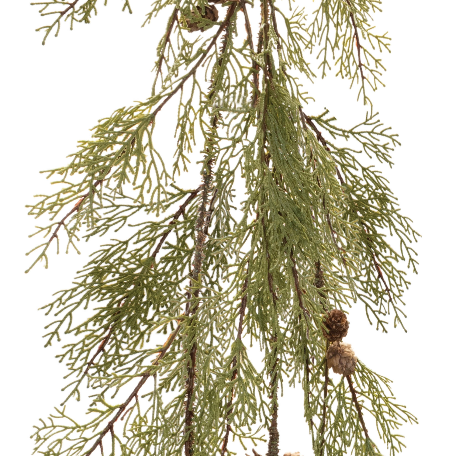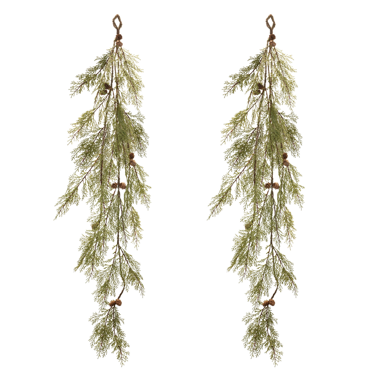 Create a cozy, woodland-inspired holiday display with this Pine and Pinecone Garland set. Featuring wintry green and brown tones, this garland showcases realistic pine foliage accented with mini pinecones for a natural, rustic look. The wired base and branches offer flexibility for shaping and sturdy placement, making it easy to drape along a fireplace mantel, staircase railing, or tabletop display. Enhance its festive charm by adding holiday floral picks, ornaments, or twinkle lights to complete the look. Sold in a set of two matching pieces.